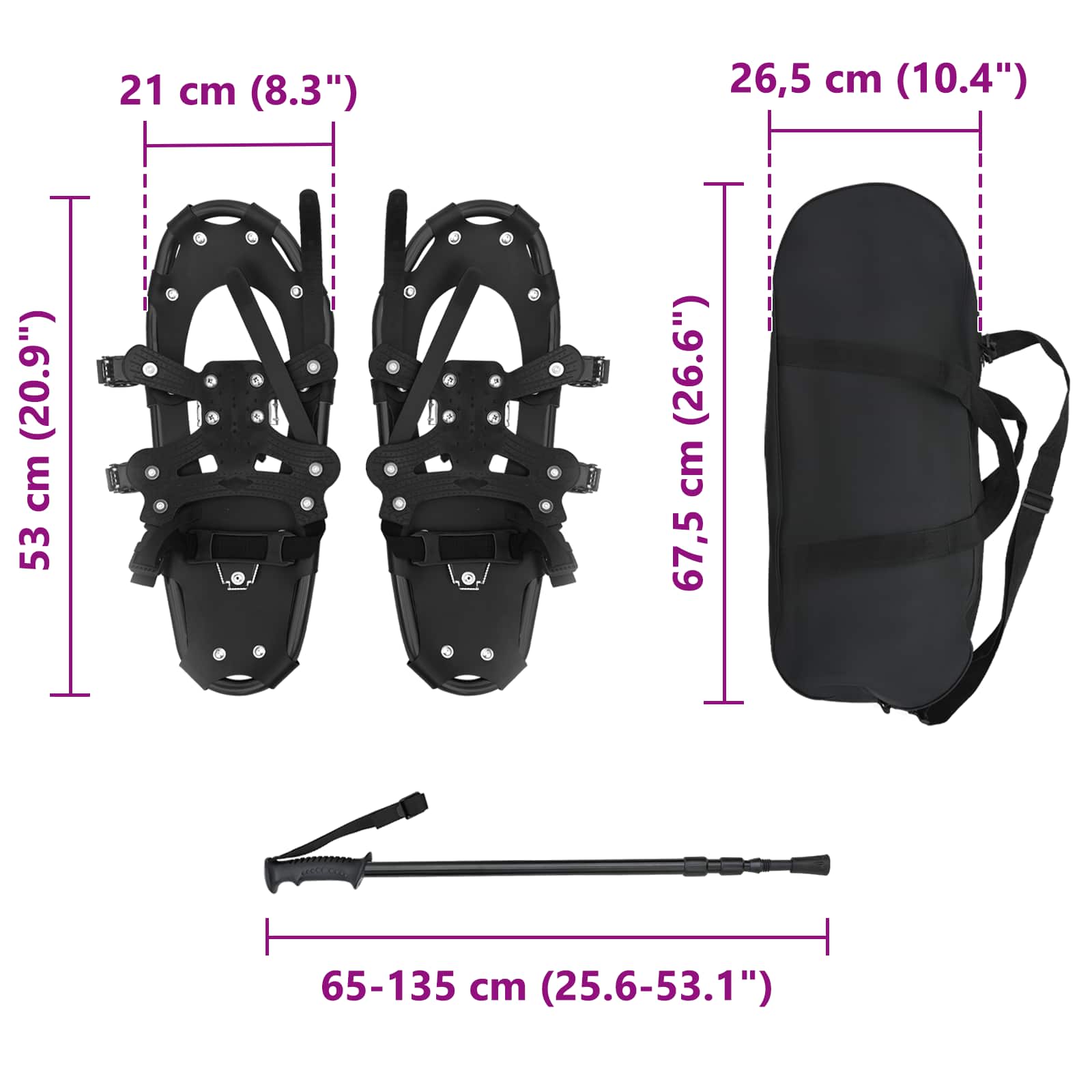 Aluminirunko ja polyeteenipohja: Kestävä alumiinirunko ja polyeteenipohja kestää kovaa menoa ulkona, joten saat varmasti luotettavaa suorituskykyä lumivaelluksilla. Kylmän kestävyys varmistaa, että voit liikkua vaivattomasti lumisissa olosuhteissa. Täydellinen setti: Pakkaus sisältää parin lumikenkiä, kaksi säädettävää vaellustankoa ja kätevän kantopussin, mikä on täydellinen valinta, jos etsit kaikki yhdellä hankinnalla. Kaikki osat on suunniteltu helppoon kuljetukseen ja säilytykseen, niin olet aina valmis seikkailuun. Kylmän kestävät ominaisuudet: HDPE-pohja on tehty erityisesti kylmiquesi olosuhteissa ja säädettävä kantanyöri auttaa pitämään jalat paikoillaan. Näin varmistat mukavuuden ja hallinnan kaikilla maastoilla. Monipuoliset käyttötavat: Yksi setti toimii niin vuoristovuorilla kuin eristyneillä poluillakin, ja se mukautuu kenkäkokoihin 38-48 ratchet-järjestelmän avulla, joten se käy moneen käyttöön. Helppo huolto: Säilytä varusteet viileissä ja kuivissa paikoissa, ja pyyhi ne puhtaaksi kuivalla liinalla, niin säilytät niiden hyvän kunnon. Vältä kävelyä asfaltilla eheyden säilyttämiseksi, ja tarkista varusteet ennen kauden käyttöönottoa.`