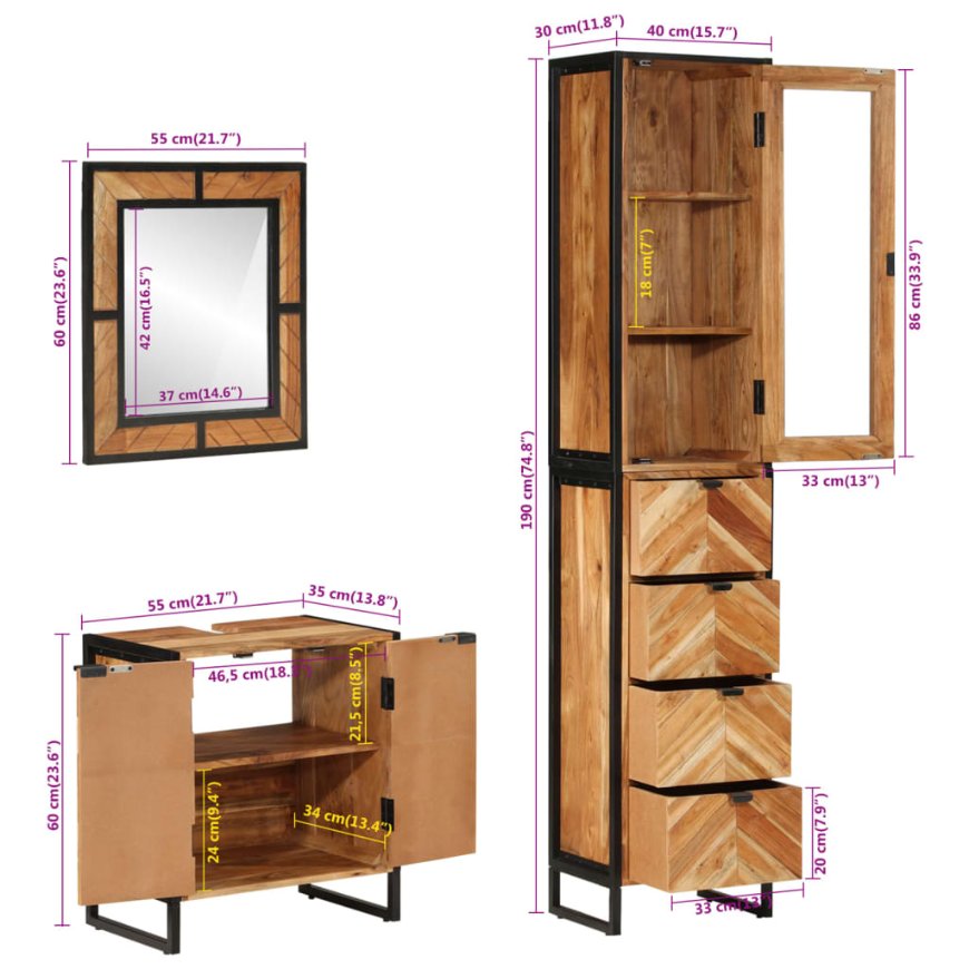 3-osainen Kylpyhuoneen kalustesarja rauta ja täysi akasiapuu