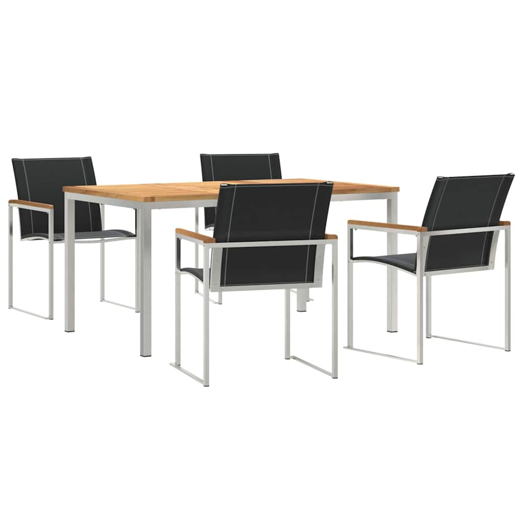 Tämä puutarhan ruokailusarja on oiva vaihtoehto ulkona ruokailuun ja sisältää tilavan suorakaiteisen pöydän sekä neljä tyylikästä tuolia. Valmistettu kiinteästä akaasiapuun ja kestävistä jauhemaalatuista teräsrakenteista, tämä setti on kaino mutta käytännöllinen lisä mihin tahansa parvekkeeseen tai puutarhaan.