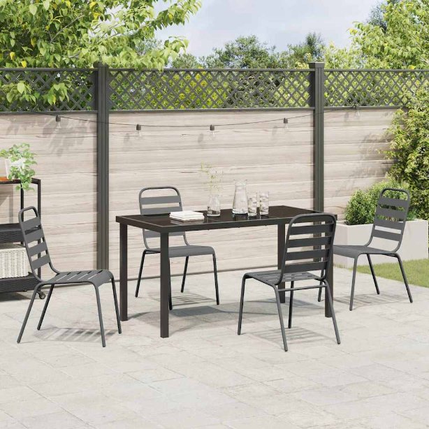 Tutustu 5-osaisen puutarhan ruokailusettiin tummanharmaasta teräksestä – täydellinen valinta ulkoalueen tunnelman parantamiseen. Setti sisältää 4 tuolia ja ruokapöydän, joten se on mainio mahdollisuus rentoutua perheen ja ystävien kanssa.