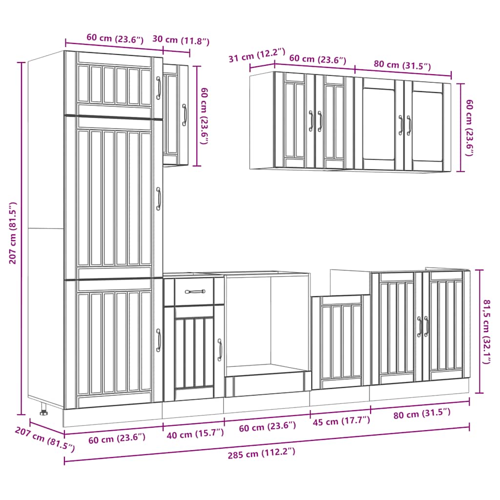 • Runsaasti säilytystilaa: Keittiön kaappisarjassa on useita osastoja, ja se tarjoaa riittävästi tilaa kulhoille, lautasille, kattilille ja muille keittiökoneille.
