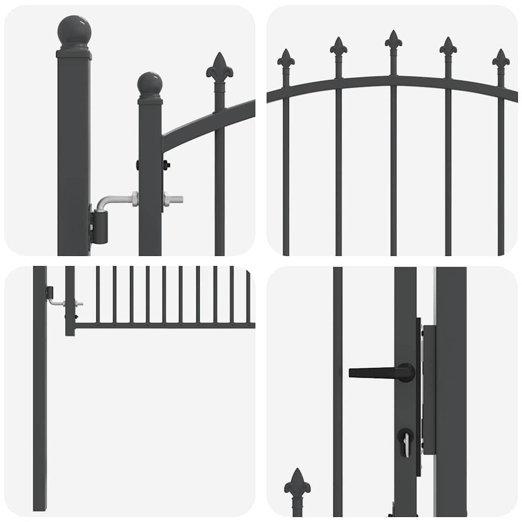 • Arkkitehtoninen Tyyli: Kaareva yläosa ja sirot piikit tekevät portista tyylikkään esteen omaisuudellesi. Tämä suunnittelu ei vain lisää visuaalista viehätystä, vaan estää myös kiipeämistä. Tasapaino muotoilun ja toimivuuden välillä tekee siitä soveltuvan moniin ulkotiloihin.