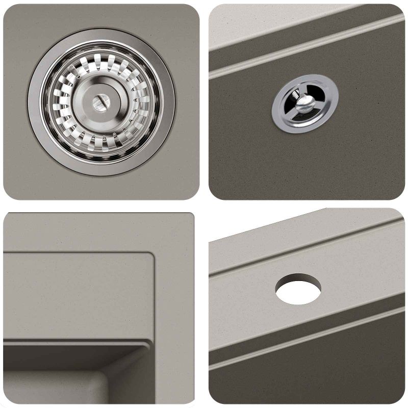 • Valmistettu graniitista: Tämä allas on graniittia, joka kestää lämpöä, naarmuja ja tahroja. Se tarjoaa tyylikästä eleganssia ja pitkäikäisyyttä, tehden siitä käytännöllisen valinnan kiireisiin keittiöihin, joissa ruoanlaittoa ja siivousta tapahtuu usein.