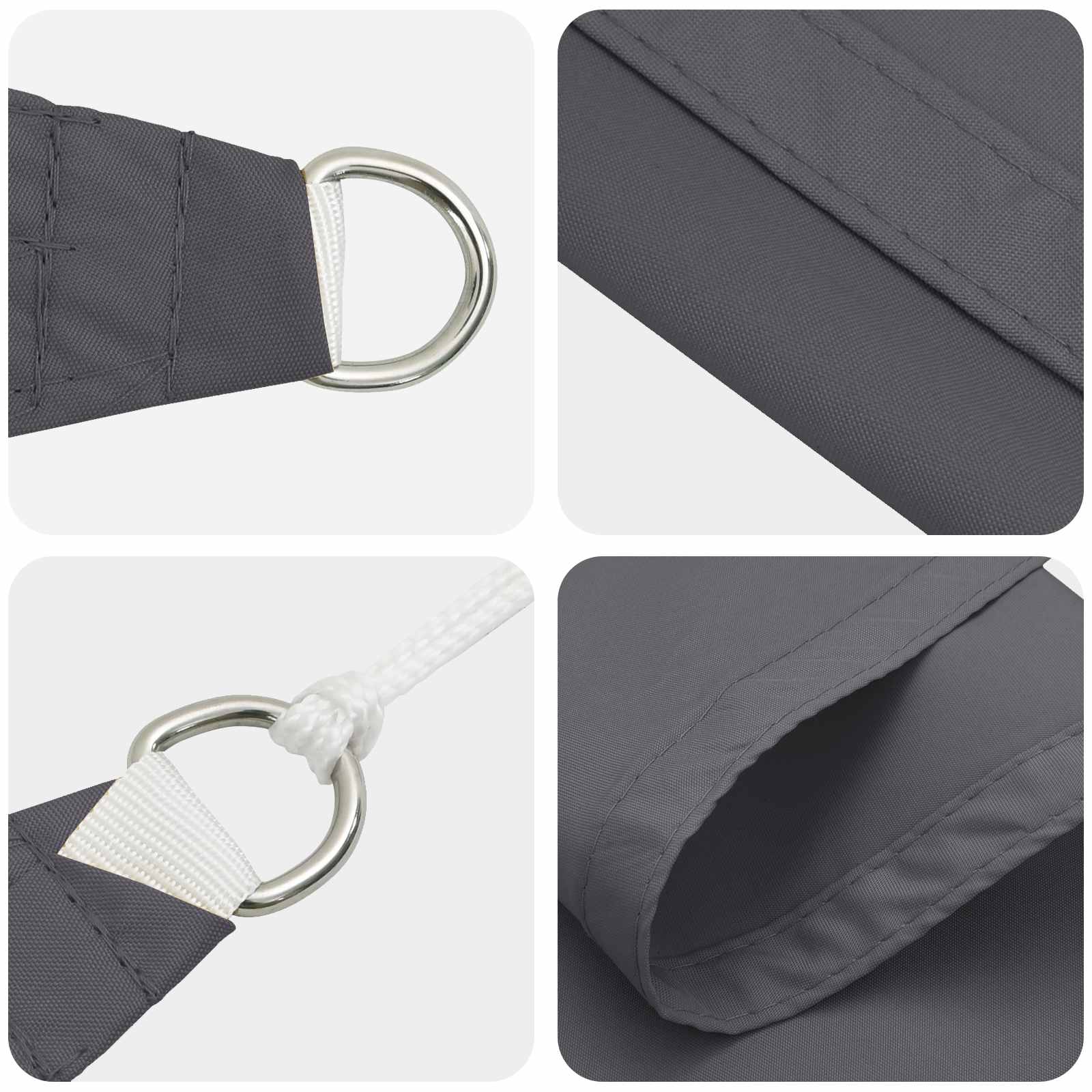 • Säänkestävyys: Aurinkosuojapurje on tehty polyesteri oxford -kankaasta. Se suojaa auringolta ja on vedenkestävä, pitäen ulkotilasi kunnossa sekä aurinkoisilla että sadepäivillä.