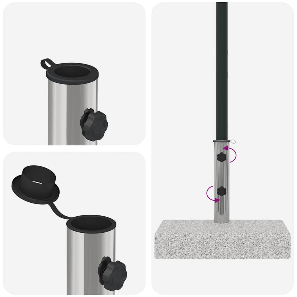 Aurinkovarjon alustassa on kestävä graniittirakenne, joka on todella vakaa sen painon ansiosta. Graniitin ulkonäkö on myös tyylikäs ja tunnelma, joka antaa aurinkovarjon alustalle sivistyneen ulkonäön, joka lisää hieman eleganssia ulkotilaasi ja täydentää ylellisiä puutarhahuonekaluja. Putki on valmistettu ruostumattomasta teräksestä.