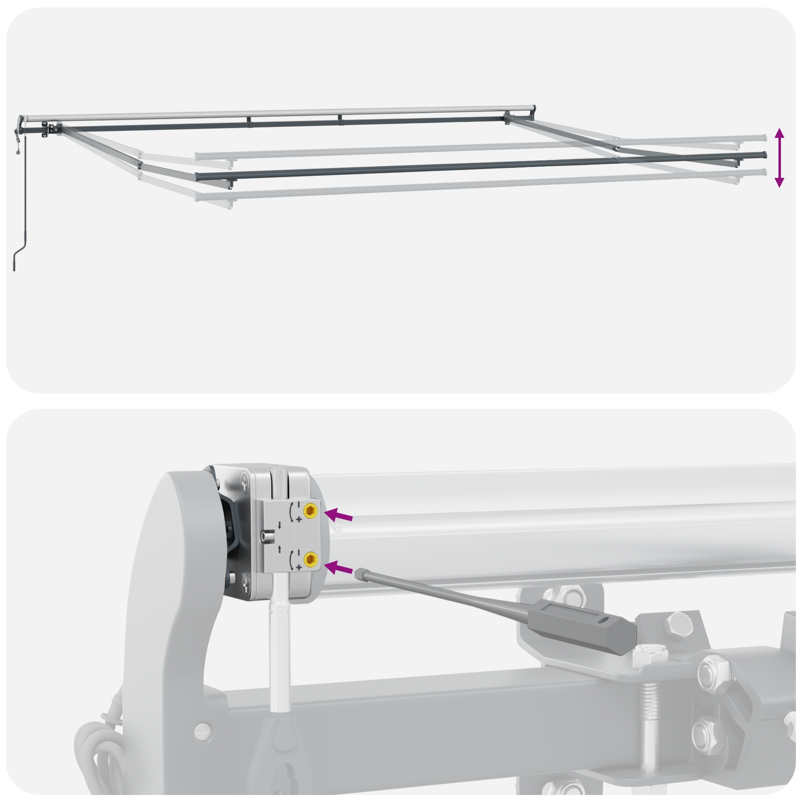 Vaara! Avaamisen yhteydessä on voimakas jousi. ÄLÄ irrota köyttä, jos et ole saattanut kaikkia kokoonpanon vaiheita loppuun, kiristänyt kaikkia pultteja ja kiinnittänyt tuotetta seinään! Varoitus! Ole varovainen, kun irrotat varsia, koska ne ovat jännittyneitä! Taitetun markiisin varren äkillinen vapauttaminen voi aiheuttaa vammoja. Varoitus: käyttöohjeet on luettava ennen tuotteen käyttöä. Varoitus: Tuotteen käyttö pakkasella voi vahingoittaa sitä. Ulkoinen käyttö rakennuksissa ja muissa rakennustöissä. Älä anna lasten leikkiä kaihtimen ohjauslaitteella. Pidä kaukosäädin poissa lasten ulottuvilta.