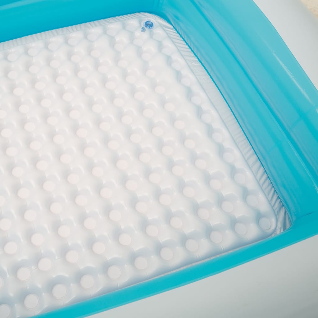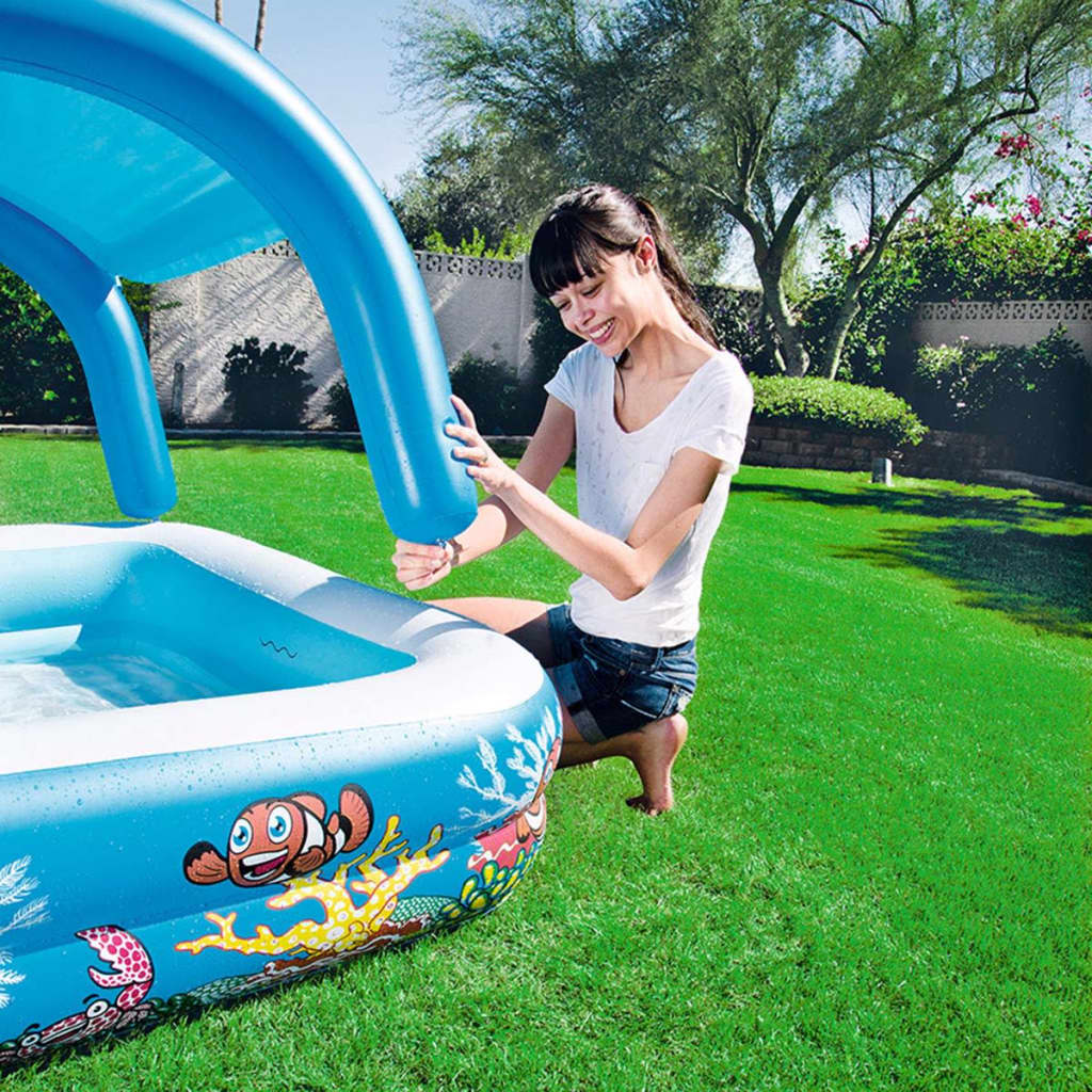 Laadukkaan vinyylin ja pehmustetun mukavan pohjansa ansiosta puhallettava uima-allas on vakaa ja kestävä. Mukana tulee helposti kiinnitettävä ja irrotettava katos, joka suojaa lapsia auringon haitallisilta säteiltä.