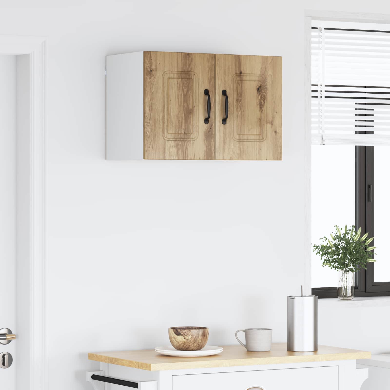 Tää keittiön seinäkaappi tuo modernia fiilistä keittiöön ja tarjoaa paljon säilytysvaihtoehtoja, jotta keittiö pysyy siistinä. Sen puhtaat linjat ja valkoinen runko luo minimalistisen ja toimivan ilmeen, mikä tekee siitä hyvän erilaisiin keittiötyyleihin. Se on loistava paikka astioille, ruoalle tai muille keittiötarvikkeille. Tämä seinäkaappi yhdistelee toimivuutta ja tyylikästä muotoilua, parantaen kaikkia ruoanlaittotiloja.