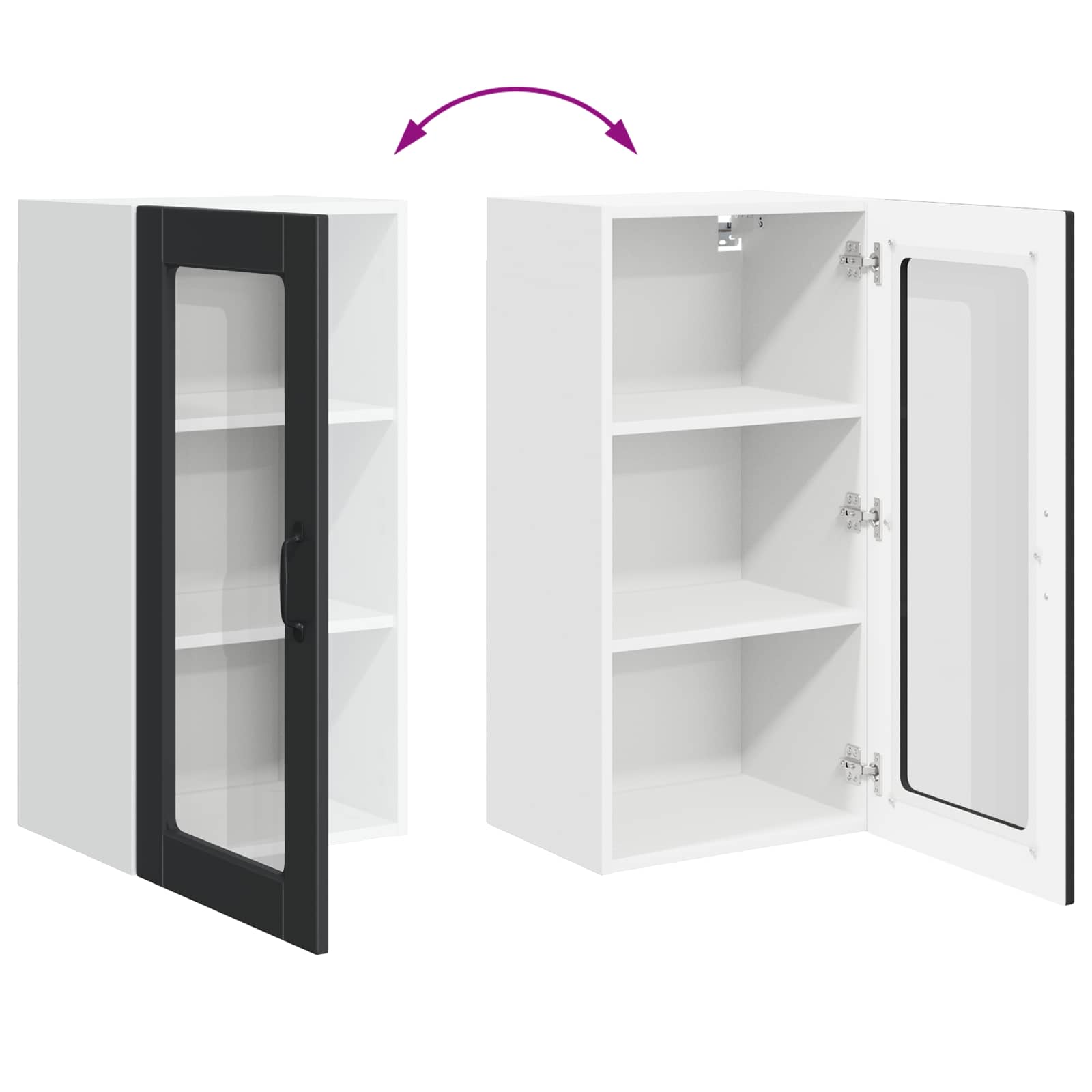• Saranoidut ovet: Tyylikkäät saranoidut ovet lisäävät modernia ilmettä ja mahdollistavat sujuvan käytön. Mustat kahvat tuovat kaappiin näyttävää kontrastia, joka viehättää silmää.