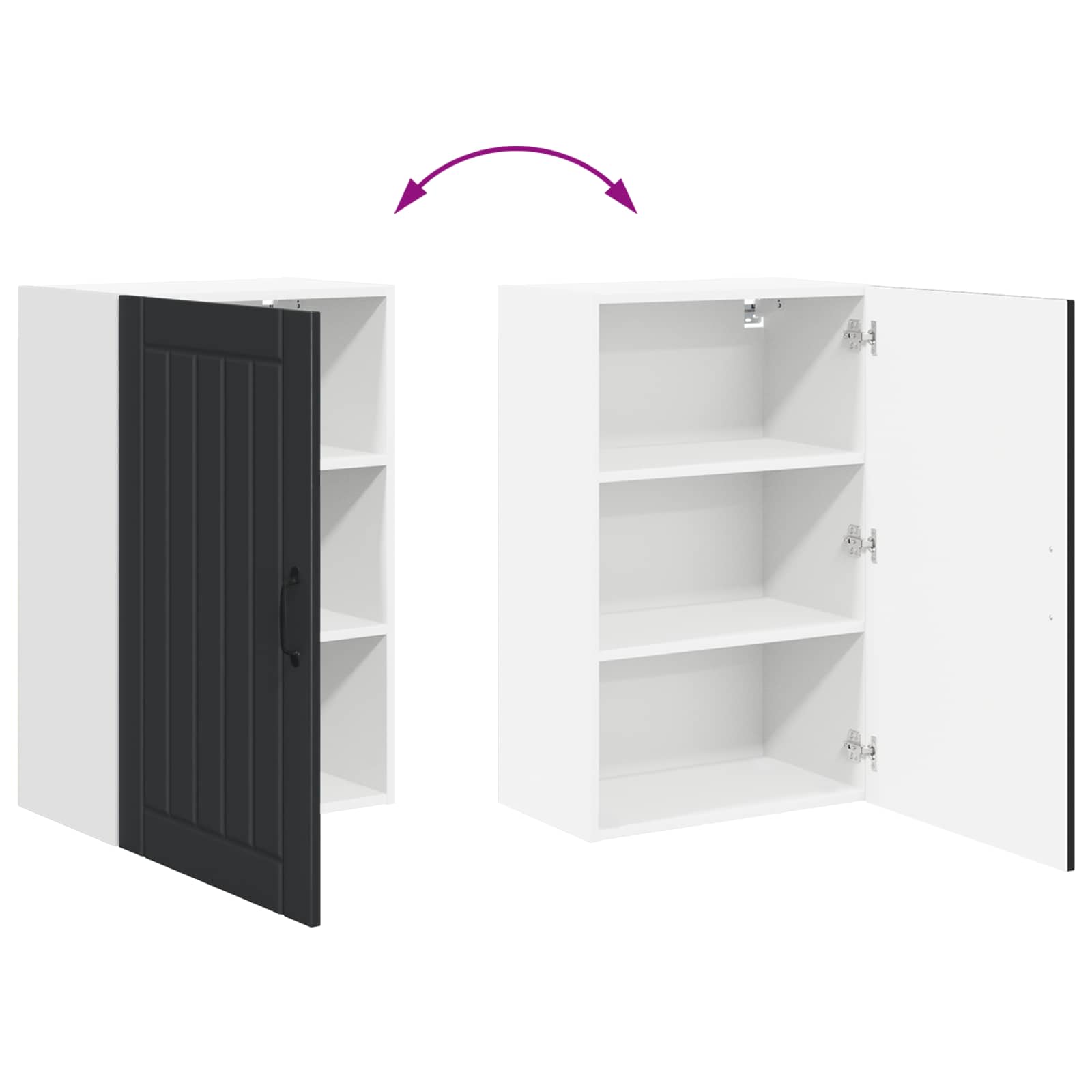 • Saranoidut ovet: Tyylikkäät saranoidut ovet lisäävät modernia ilmettä ja mahdollistavat sujuvan käytön. Mustat kahvat tuovat kaappiin näyttävää kontrastia, joka viehättää silmää.