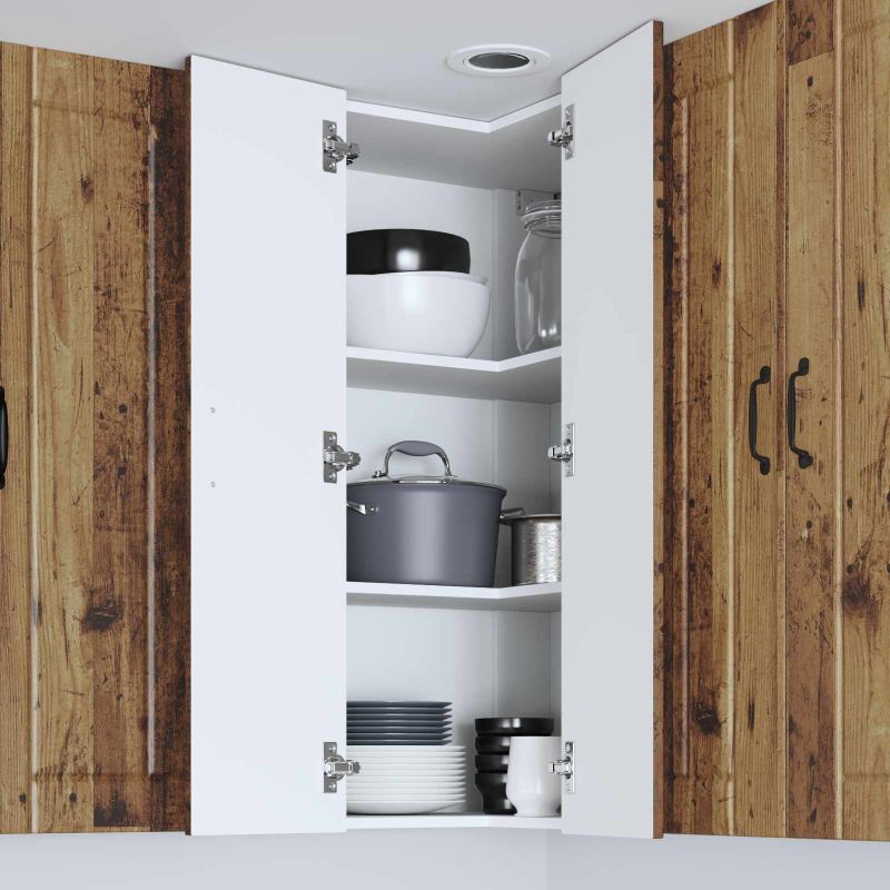 • Hyllysuunnittelu: Levyhyllyjen ansiosta on helppoa pitää keittiön välttämättömät asiat järjestyksessä. Hyllyt ovat muokattavissa, mikä helpottaa astioiden, mausteiden tai keittovarusteiden säilyttämistä. Selkeä hyllyjärjestely tekee keittiöstä mukavan ja siistin.