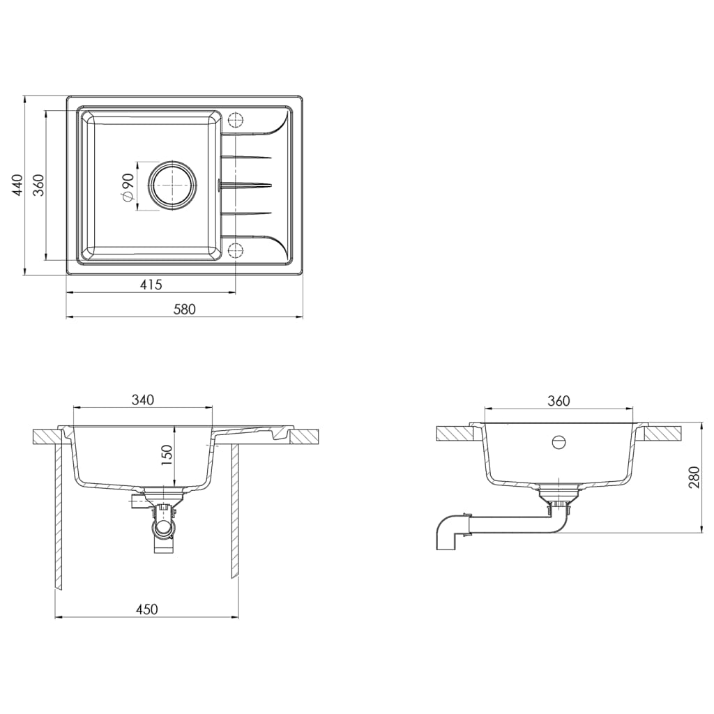 Tiskiallas on valmistettu graniitista, joten se on lämmön-, naarmun ja iskunkestävä sekä helppo puhdistaa. Sivussa oleva viemärireikä antaa lisätilaa tiskeillesi. Koska tiskiallas on täysin käännettävä, niin se voidaan asentaa pesualtaan oikealle tai vasemmalle puolelle. Korisiivilä mukana helpon roskien keräämiseen takaamiseksi. Viemärireiän halkaisija on 90 cm.