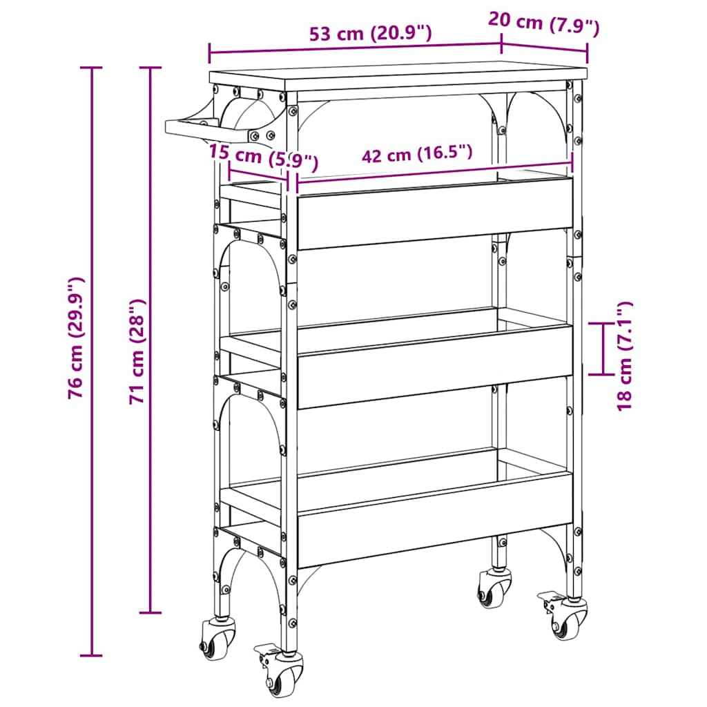 • Tila mielessä Kompaktiksi suunniteltu vaunu vie todella vähän tilaa, mutta tarjoaa maksimimäärän pintakäyttöä. Sen 53 x 20 x 76 cm koko on ihanteellinen tarpeiden säilyttämiseen ilman iso häiriköintiä.