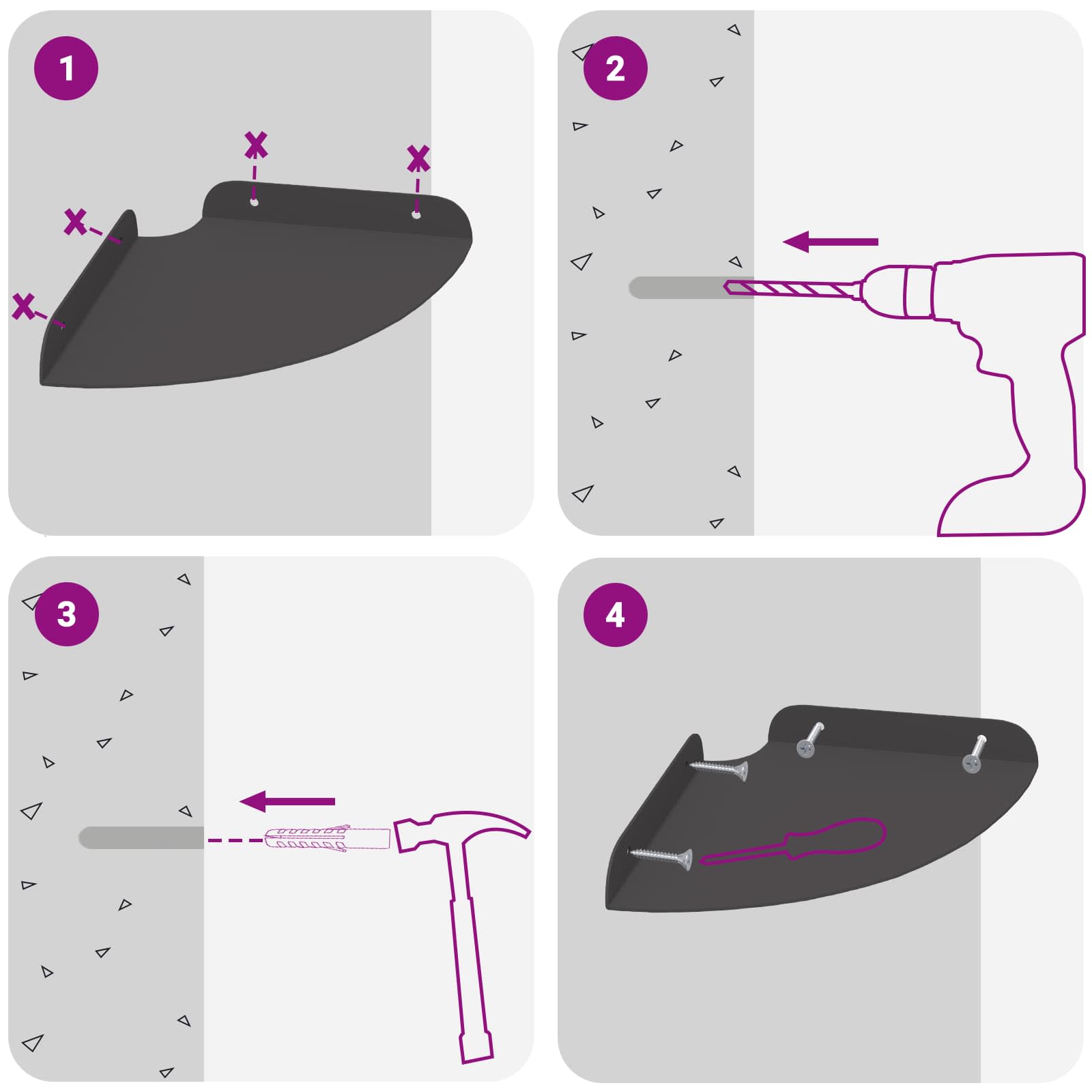 • Seinään asennettavat ruuvit ja tulpat eivät sisälly toimitukseen. Suosittelemme hankkimaan ja käyttämään juuri omille seinillesi sopivia ruuveja ja tulppia.
