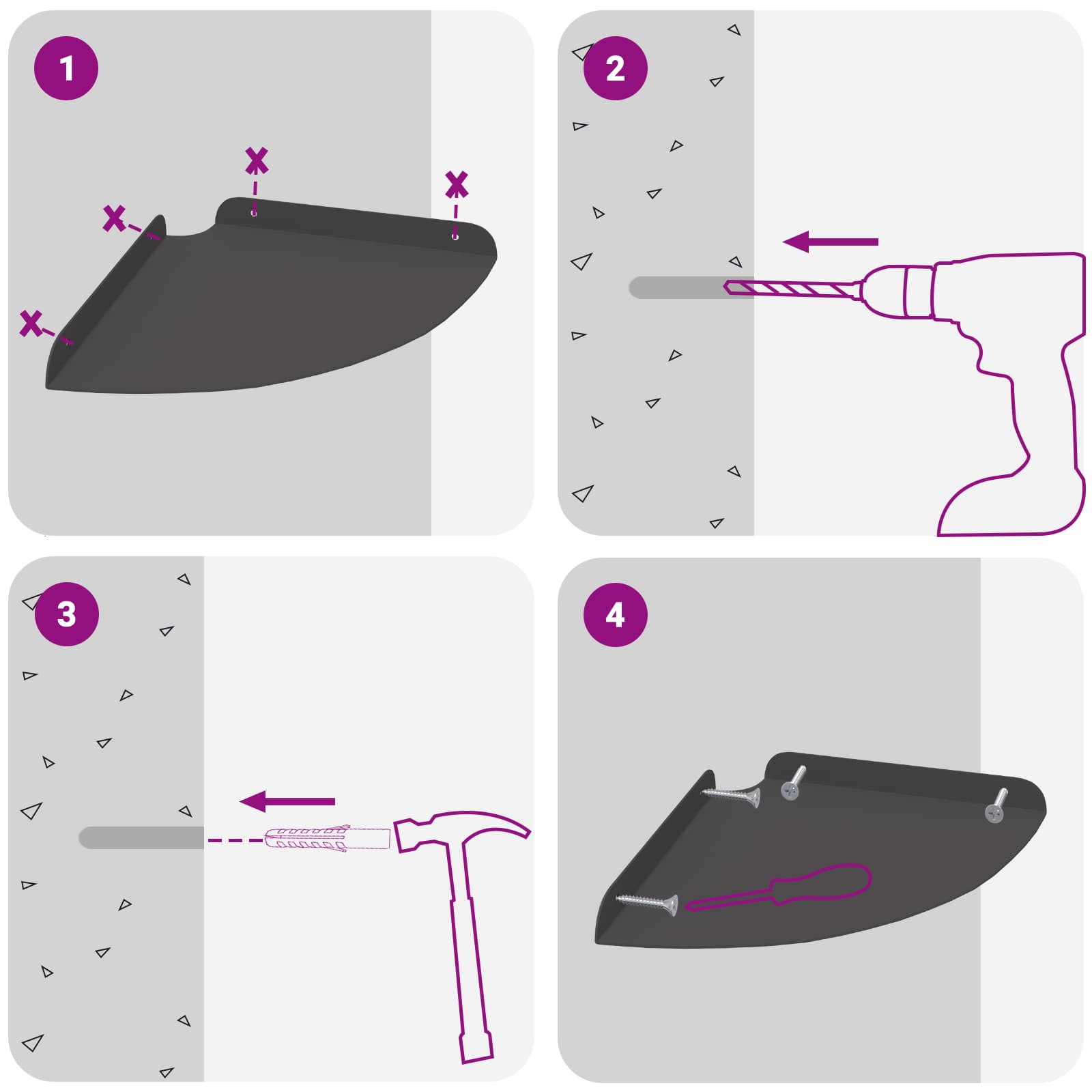• Seinään asennettavat ruuvit ja tulpat eivät sisälly toimitukseen. Suosittelemme hankkimaan ja käyttämään juuri omille seinillesi sopivia ruuveja ja tulppia.