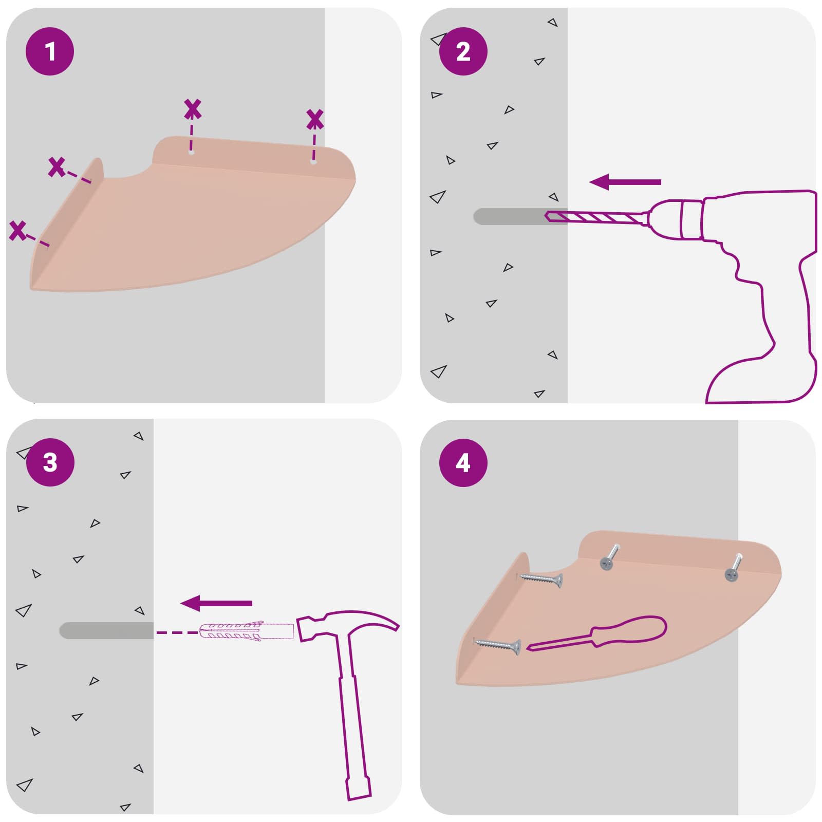 • Seinään asennettavat ruuvit ja tulpat eivät sisälly toimitukseen. Suosittelemme hankkimaan ja käyttämään juuri omille seinillesi sopivia ruuveja ja tulppia.