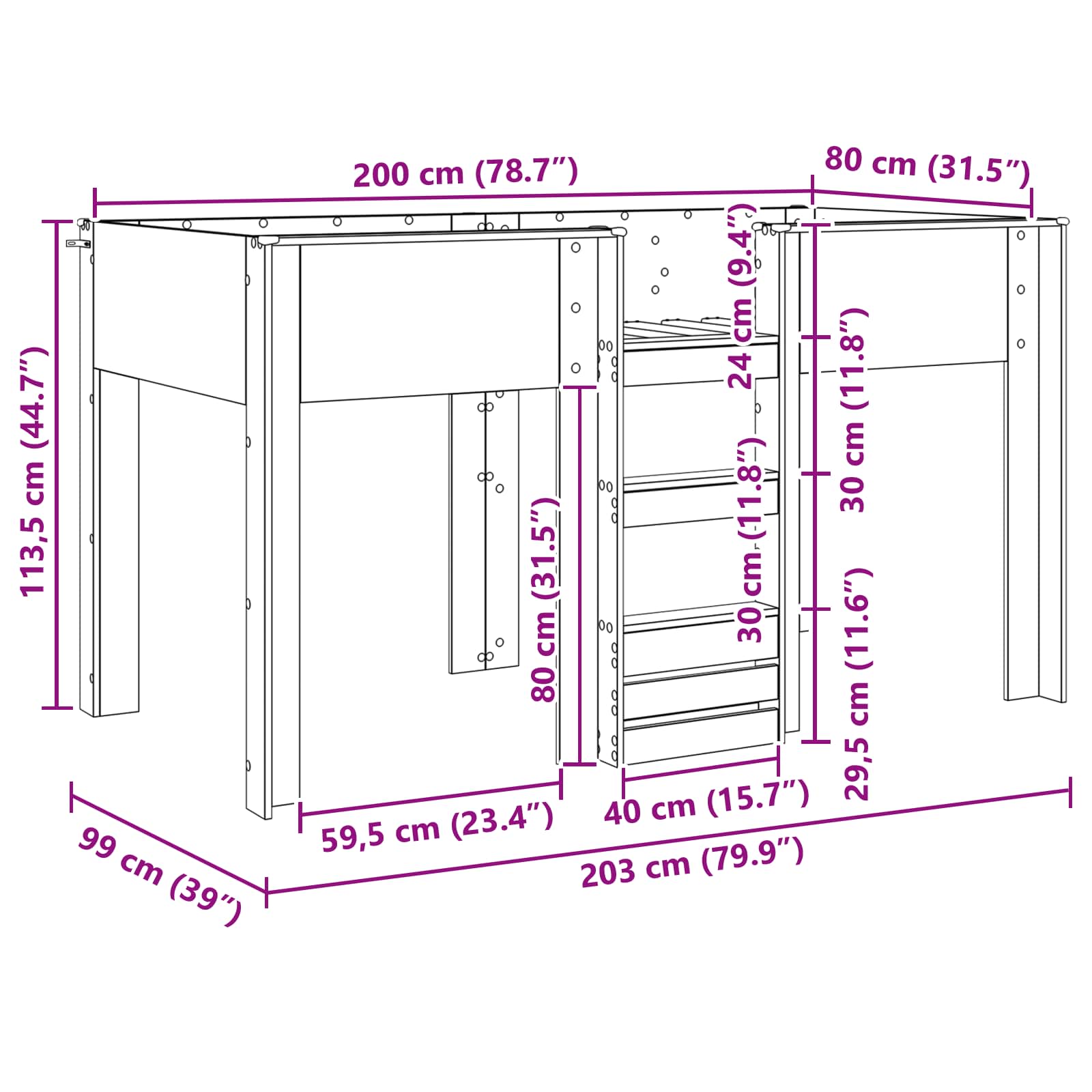 • Yleiset mitat: 203 x 99 x 113,5 cm (P x L x K)