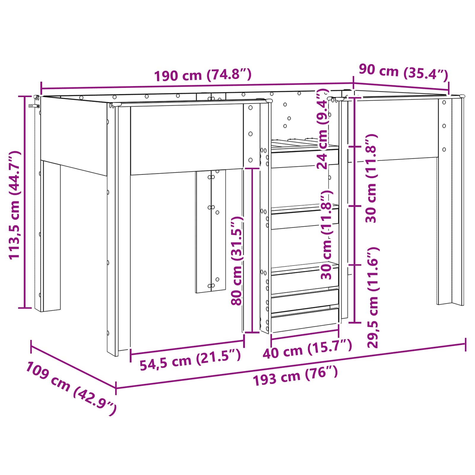 • Yleiset mitat: 193 x 109 x 113,5 cm (P x L x K)