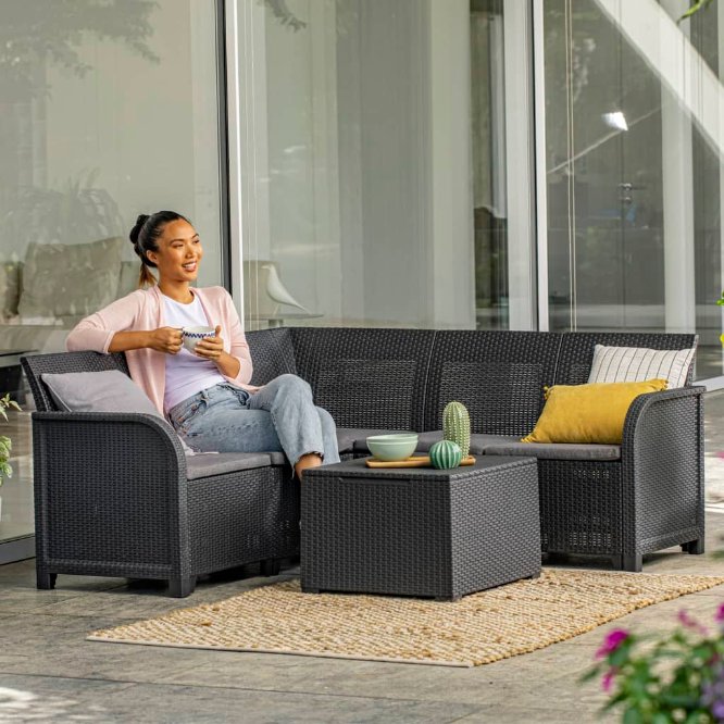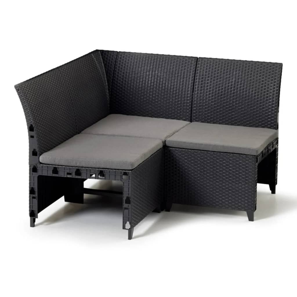 Tämä grafiitin värinen kulmasohvaelementti on osa Keter Rosalie kokoelmaa, joka sisältää erilaisia osia, joilla voit luoda oman puutarhasohvasarjan!