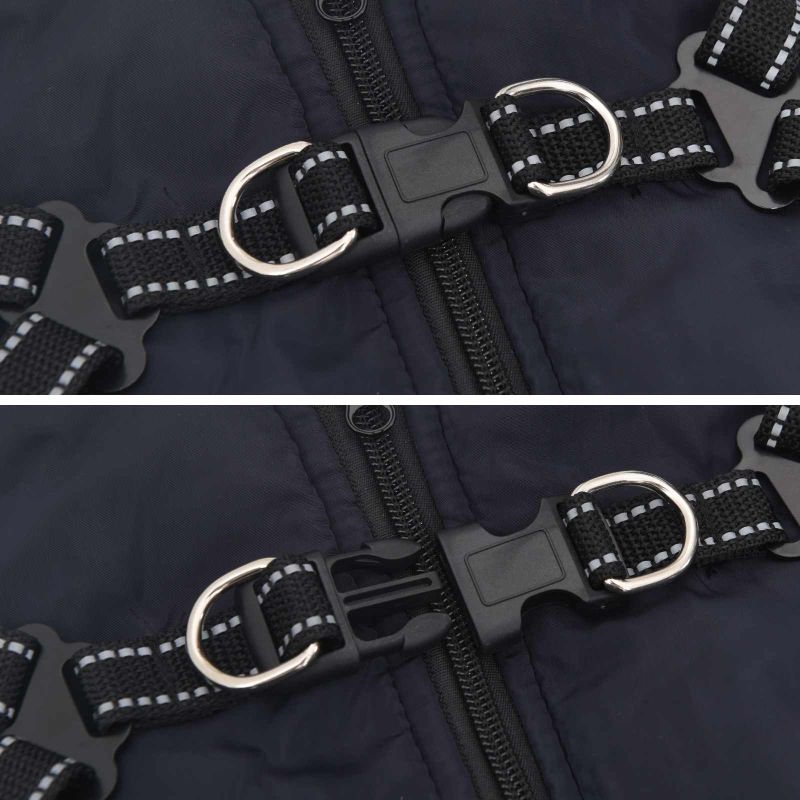 Tuulenpitävä ja vedenkestävä: Tämä fleece- ja polyesterimateriaalista tehty takki on suunniteltu kestävämmäksi talven ankarille oloille. Se pitää lemmikkisi lämpimänä ja kuivana, suojaten kylmältä ja kosteudelta ulkoilun aikana. Pituus- ja leveys säätö: Tämä takki sopii kaiken kokoisille koirille, ja siinä on säädettäviä osia, jotka takaavat parhaan istuvuuden. Säädettävät hihnat tarjoavat varman tunteen, mutta mahdollistavat myös liikkumisen vapaasti. Heijastavat turvaraidat: Takissa on heijastavia raitoja, jotka parantavat näkyvyyttä iltakävelyillä tai hämärässä. Tämä lisää koirasi turvallisuutta pitäen samalla takin tyylikkäänä. Integroitu valjas: Selässä oleva vetoketju ja D-renkaat mahdollistavat käytännöllisen sisäänrakennetun valjasjärjestelmän. Se takaa turvalliset kiinnitykset, eikä lisäkaulureita tarvita, mikä helpottaa ulkoilua. Mukava fleece-vuori: Takissa oleva fleece-vuori lisää lämpöä ja mukavuutta, jolloin koirasi nauttii sen käytöstä kylmällä säällä. Tämä takki on suunniteltu pitkäaikaista käyttöä varten ilman, että se tuntuu epämukavalta.