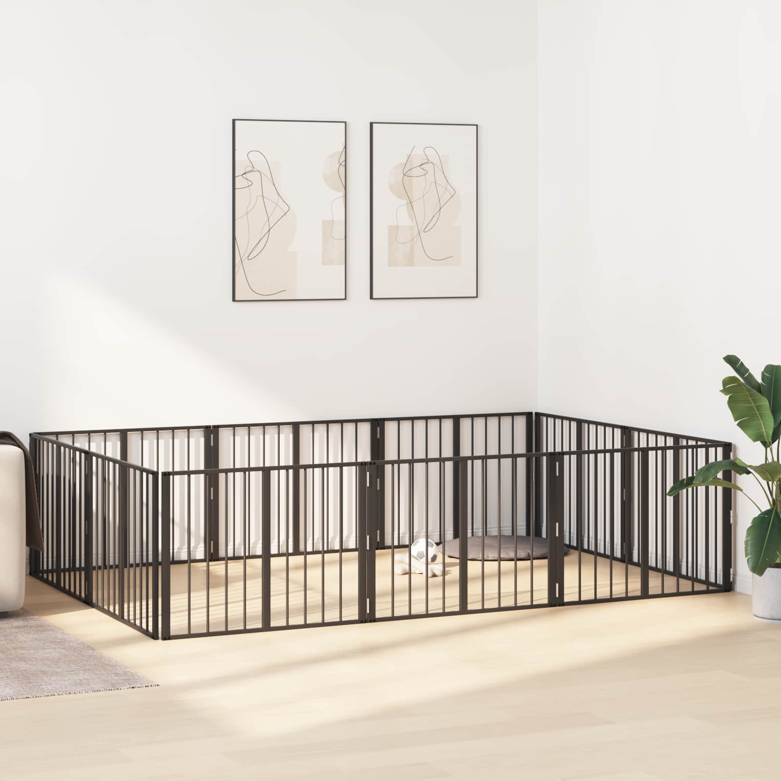 Tämä minimalistinen metallinen koiraaitaus on juuri se, mitä tarvitset turvallisen tilan luomiseen karvaisille ystäville ulkona olohuoneessa. Tämä monipuolinen sisustus on helppo mukauttaa, jotta pennut ja pienet koirat voivat liikkua ja leikkiä turvallisesti. Kuumasinkitystä teräksestä tehty aitauksen yhdistää kestävyyden ja helppohoitoisuuden, joten se on loistava valinta kaikille lemmikin rakastajille. Mustat verkkoalueet tarjoavat näkymän aitauksen sisä- ja ulkopuolelle, varmistaen ettei lemmikkisi tunne oloaan eristyksessä. Olipa kyseessä kasvava pentuperhe tai vain yksi koirakaveri, tämä aitauksessa on täydellinen yhdistelmä tyyliä ja käytännöllisyyttä.