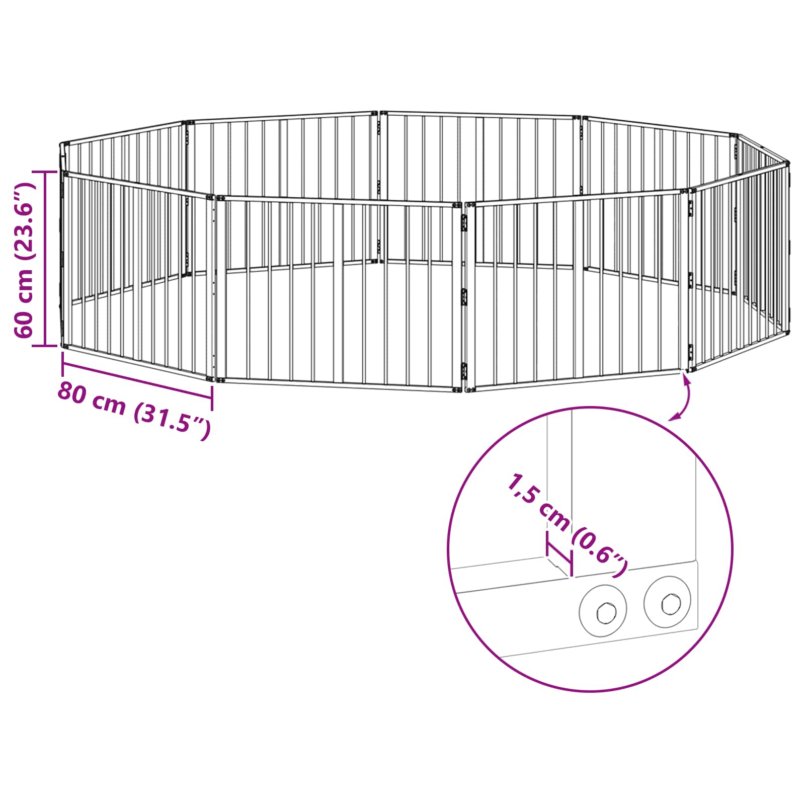 • Kuumasinkityn teräksen rakenne: Koko aitaus on valmistettu kuumasinkitystä teräksestä, joka tarjoaa tukevan ja kestävän rungon, joka kestää päivittäisen käytön kulumista. Tämä takaa sekä jäykkyyden että pitkän käyttöiän, mikä tekee siitä ihanteellisen ratkaisun energisille lemmikeille. Tämä materiaali takaa myös minimaalisen ylläpidon, sillä lisähoitoja ei tarvita.