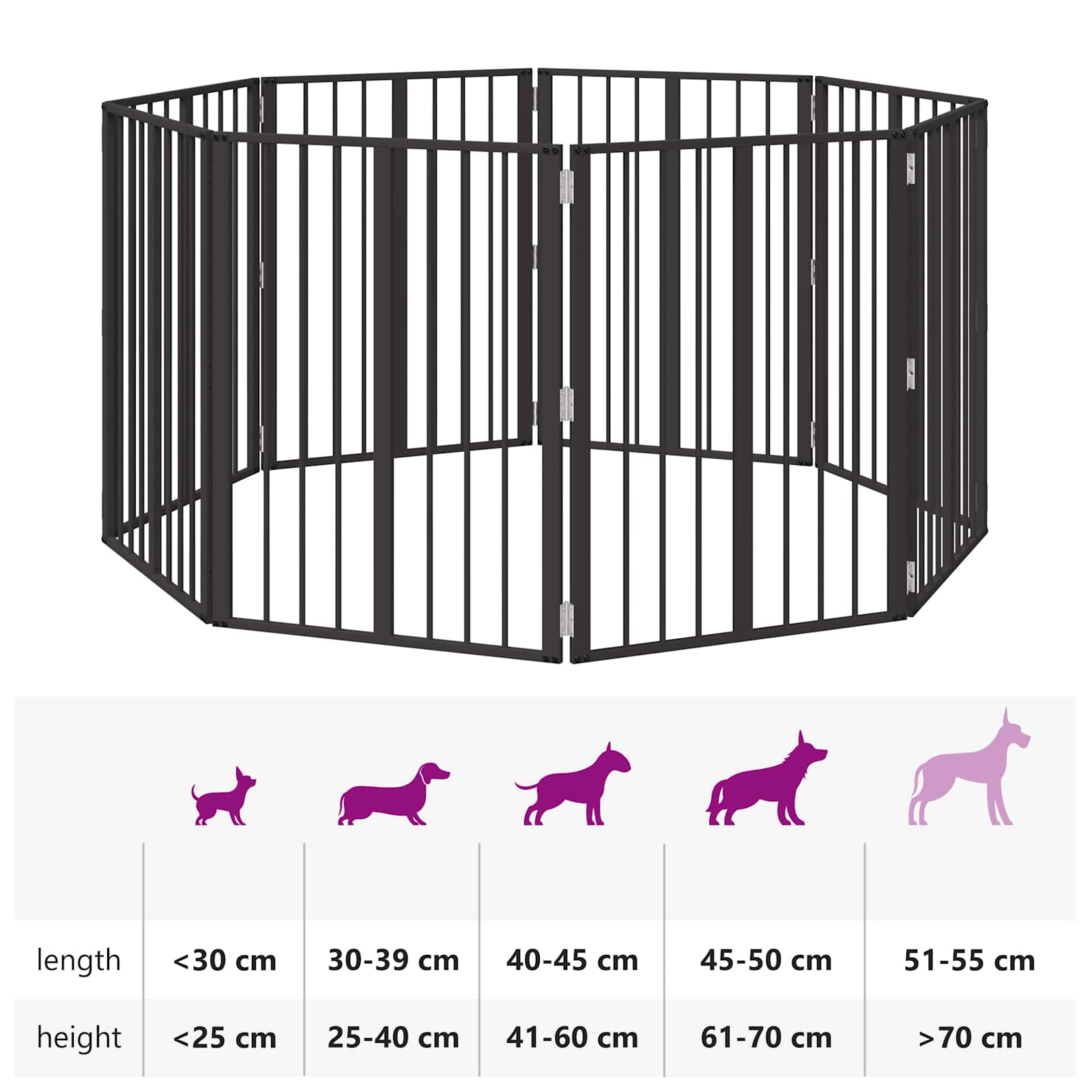 • Monikäyttöiset käyttötarkoitukset: Sopiva turvallisten sisätilojen luomiseen, aita voidaan asettaa oviaukkojen, käytävien tai avointen alueiden yli. Sen muunneltava muotoilu tekee siitä helpon tavan perustaa turvallinen tila, jossa koirasi voi rentoutua tai leikkiä.
