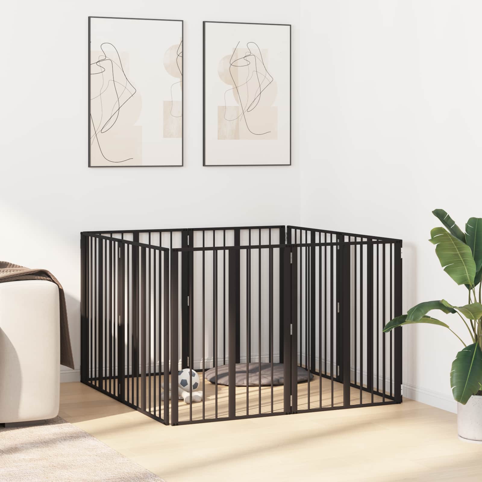 Tämä minimalistinen metallinen koiraaitaus on juuri se, mitä tarvitset turvallisen tilan luomiseen karvaisille ystäville ulkona olohuoneessa. Tämä monipuolinen sisustus on helppo mukauttaa, jotta pennut ja pienet koirat voivat liikkua ja leikkiä turvallisesti. Kuumasinkitystä teräksestä tehty aitauksen yhdistää kestävyyden ja helppohoitoisuuden, joten se on loistava valinta kaikille lemmikin rakastajille. Mustat verkkoalueet tarjoavat näkymän aitauksen sisä- ja ulkopuolelle, varmistaen ettei lemmikkisi tunne oloaan eristyksessä. Olipa kyseessä kasvava pentuperhe tai vain yksi koirakaveri, tämä aitauksessa on täydellinen yhdistelmä tyyliä ja käytännöllisyyttä.