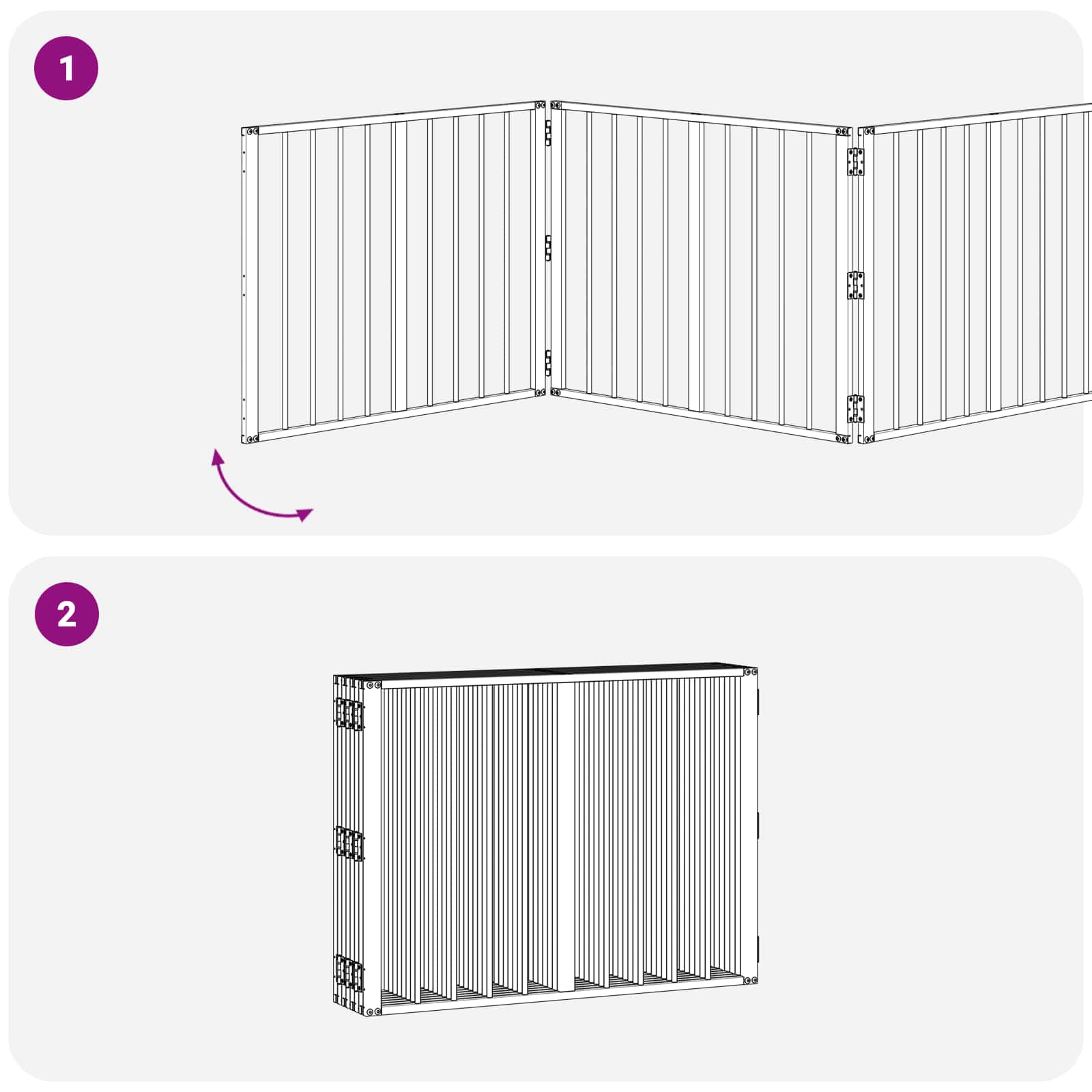 • Kuumasinkityn teräksen rakenne: Koko aitaus on valmistettu kuumasinkitystä teräksestä, joka tarjoaa tukevan ja kestävän rungon, joka kestää päivittäisen käytön kulumista. Tämä takaa sekä jäykkyyden että pitkän käyttöiän, mikä tekee siitä ihanteellisen ratkaisun energisille lemmikeille. Tämä materiaali takaa myös minimaalisen ylläpidon, sillä lisähoitoja ei tarvita.