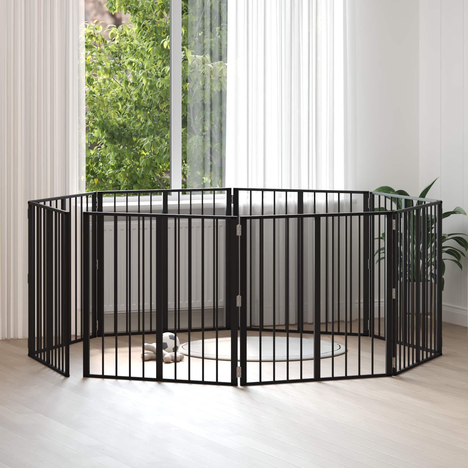 • Monikäyttöiset käyttötarkoitukset: Sopiva turvallisten sisätilojen luomiseen, aita voidaan asettaa oviaukkojen, käytävien tai avointen alueiden yli. Sen muunneltava muotoilu tekee siitä helpon tavan perustaa turvallinen tila, jossa koirasi voi rentoutua tai leikkiä.
