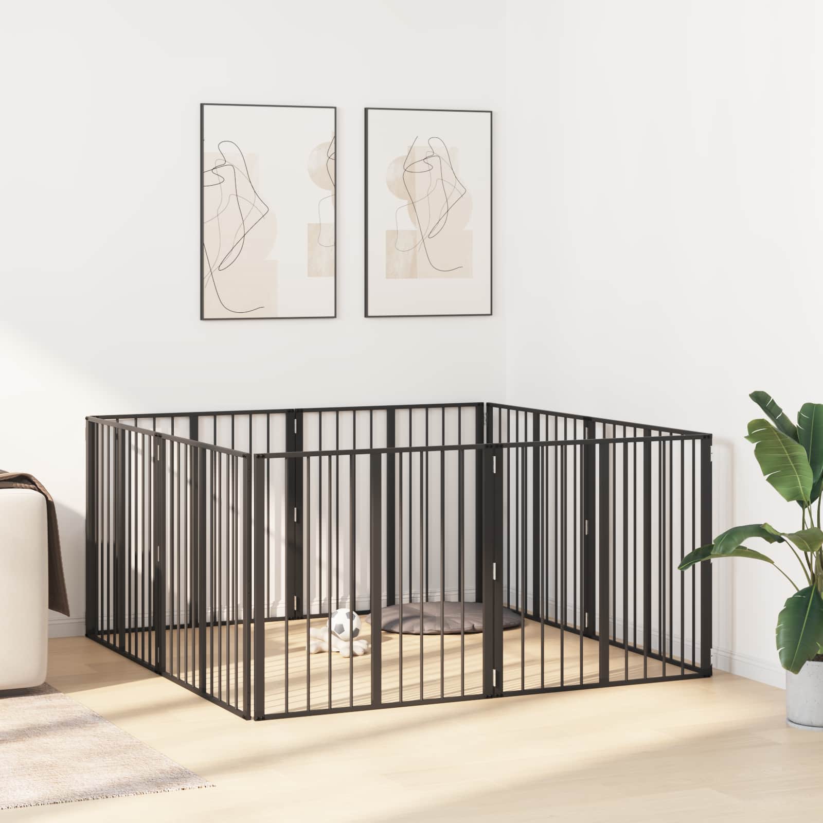 Tämä minimalistinen metallinen koiraaitaus on juuri se, mitä tarvitset turvallisen tilan luomiseen karvaisille ystäville ulkona olohuoneessa. Tämä monipuolinen sisustus on helppo mukauttaa, jotta pennut ja pienet koirat voivat liikkua ja leikkiä turvallisesti. Kuumasinkitystä teräksestä tehty aitauksen yhdistää kestävyyden ja helppohoitoisuuden, joten se on loistava valinta kaikille lemmikin rakastajille. Mustat verkkoalueet tarjoavat näkymän aitauksen sisä- ja ulkopuolelle, varmistaen ettei lemmikkisi tunne oloaan eristyksessä. Olipa kyseessä kasvava pentuperhe tai vain yksi koirakaveri, tämä aitauksessa on täydellinen yhdistelmä tyyliä ja käytännöllisyyttä.