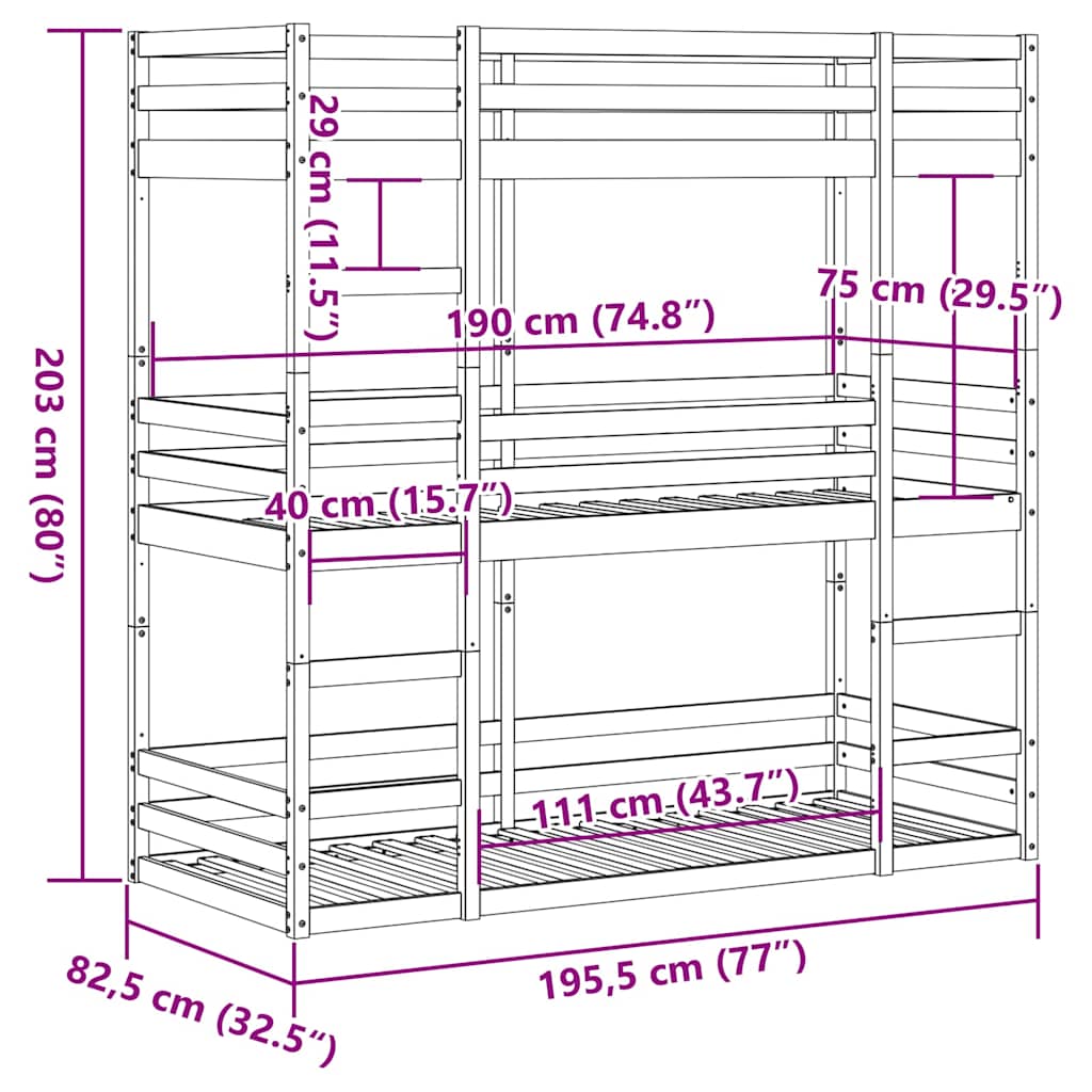 Tämä puinen kolmen hengen kerrossänky on elegantti ja toimiva, siksi se on täydellinen lisä mihin tahansa huoneeseen, jossa tilaa on rajoitetusti.