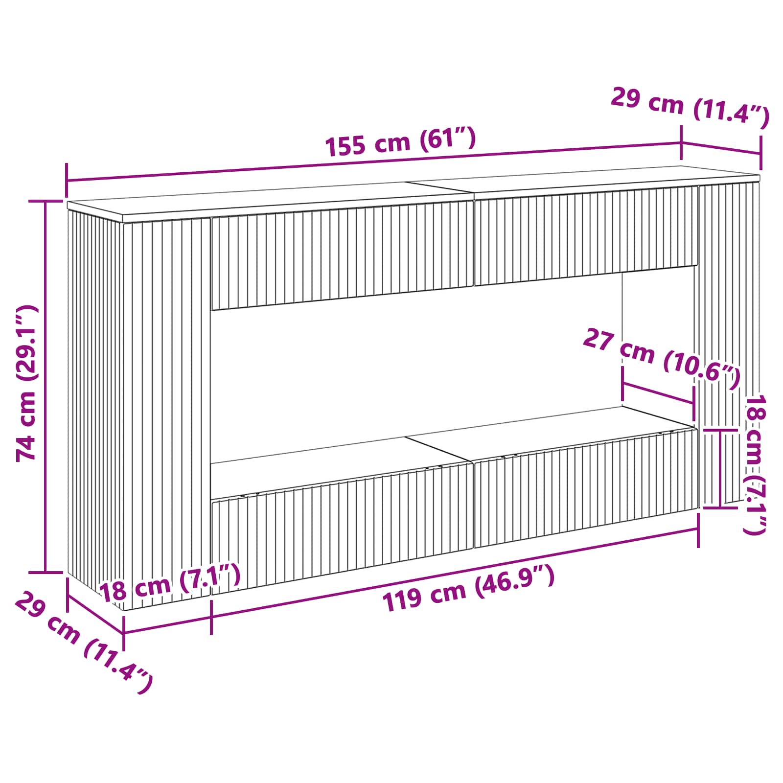 • Yleiset mitat: 155 x 29 x 74 cm (P x L x K)