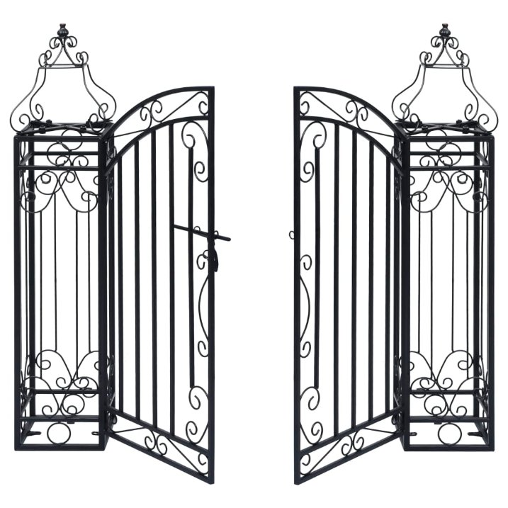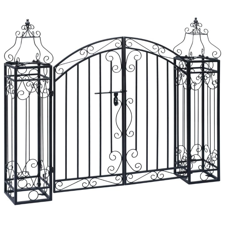 Tämä puutarhaportti on valmistettu täydellisellä ammattitaidolla ja se on valmistettu takoraudasta, jota voidaan lämmittää, taivuttaa, muotoilla ja kiertää halutun muotoiseksi. Sen mukana tulee myös pulttisarana nopeaa lukitusta varten ja kiinnityspylväät helppoa asennusta varten.