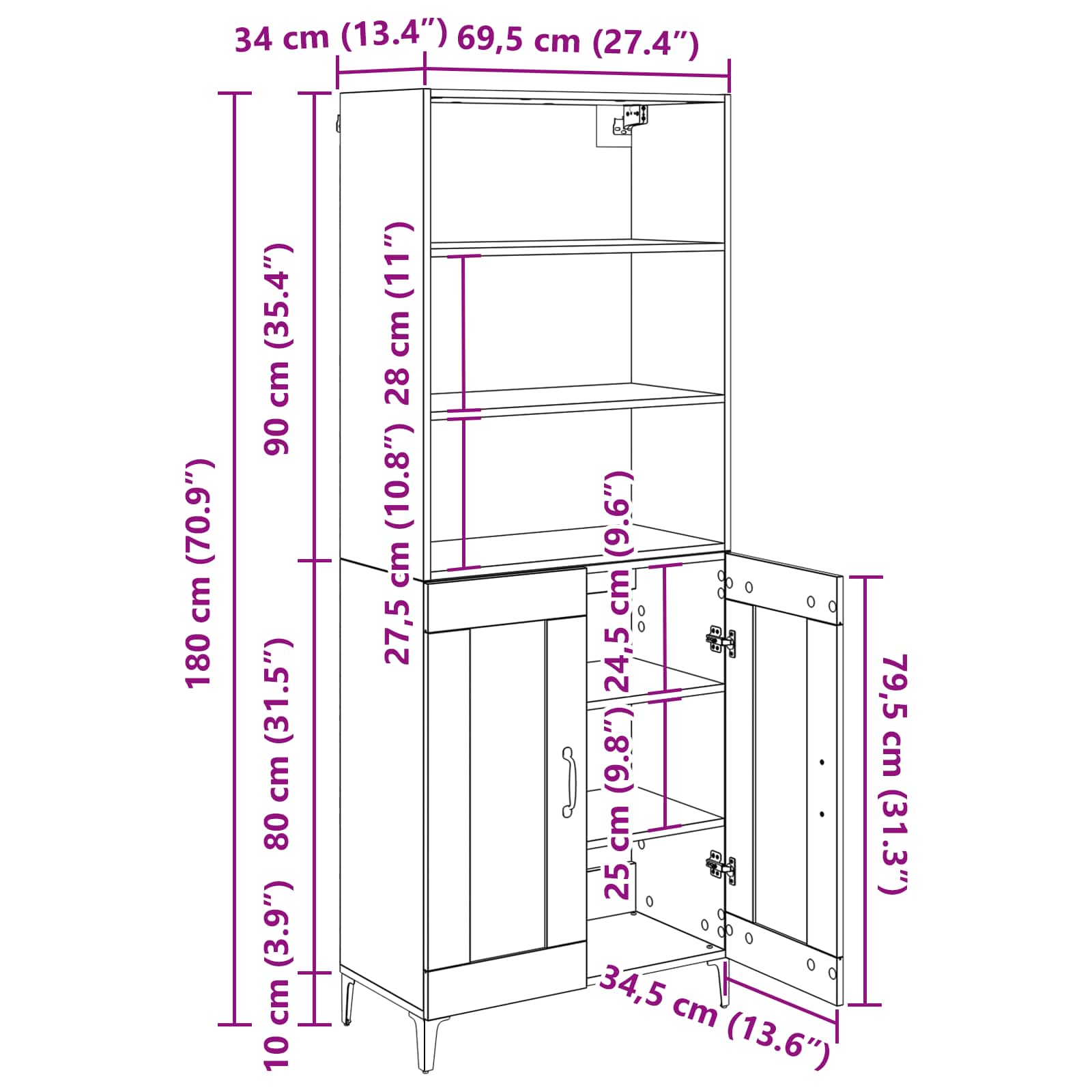 • Yleiset mitat: 69,5 x 34 x 180 cm (P x L x K)