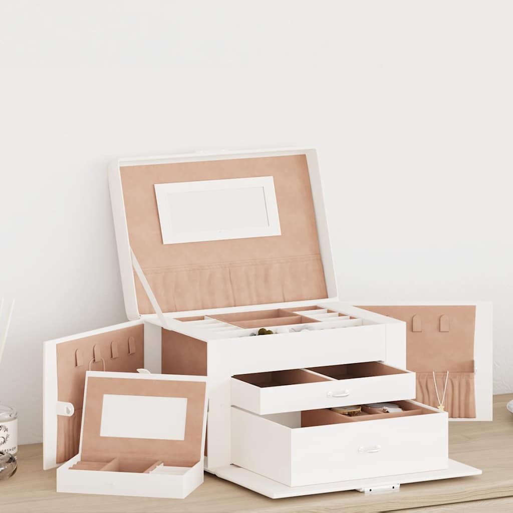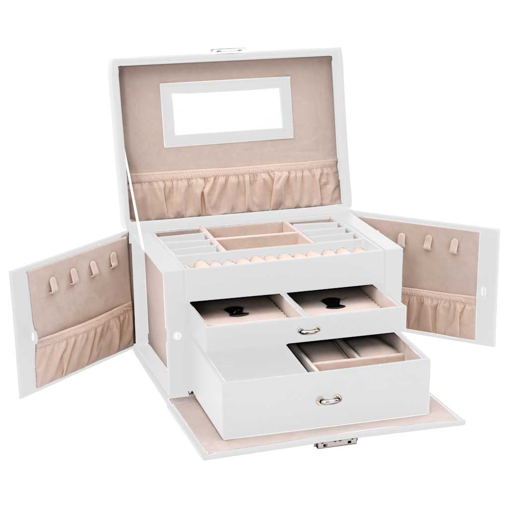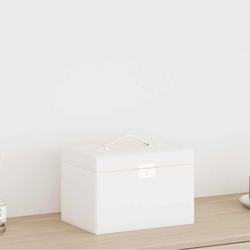 • Käytännöllinen muotoilu: Sisäänrakennettu peili lisää mukavuutta meikin levittämiseen tai ulkonäön tarkistamiseen. Tässä harkitusti suunnitellun kahvan ansiosta tämä korurasia on helppo kuljettaa mukana, joten se on monipuolinen kumppani päivittäisiin rutiineihin tai matkoille. Lisäksi yläkerroksen irrotettavan välilevyn avulla voit muokata säilytystilaa korujen koon ja muodon mukaan.