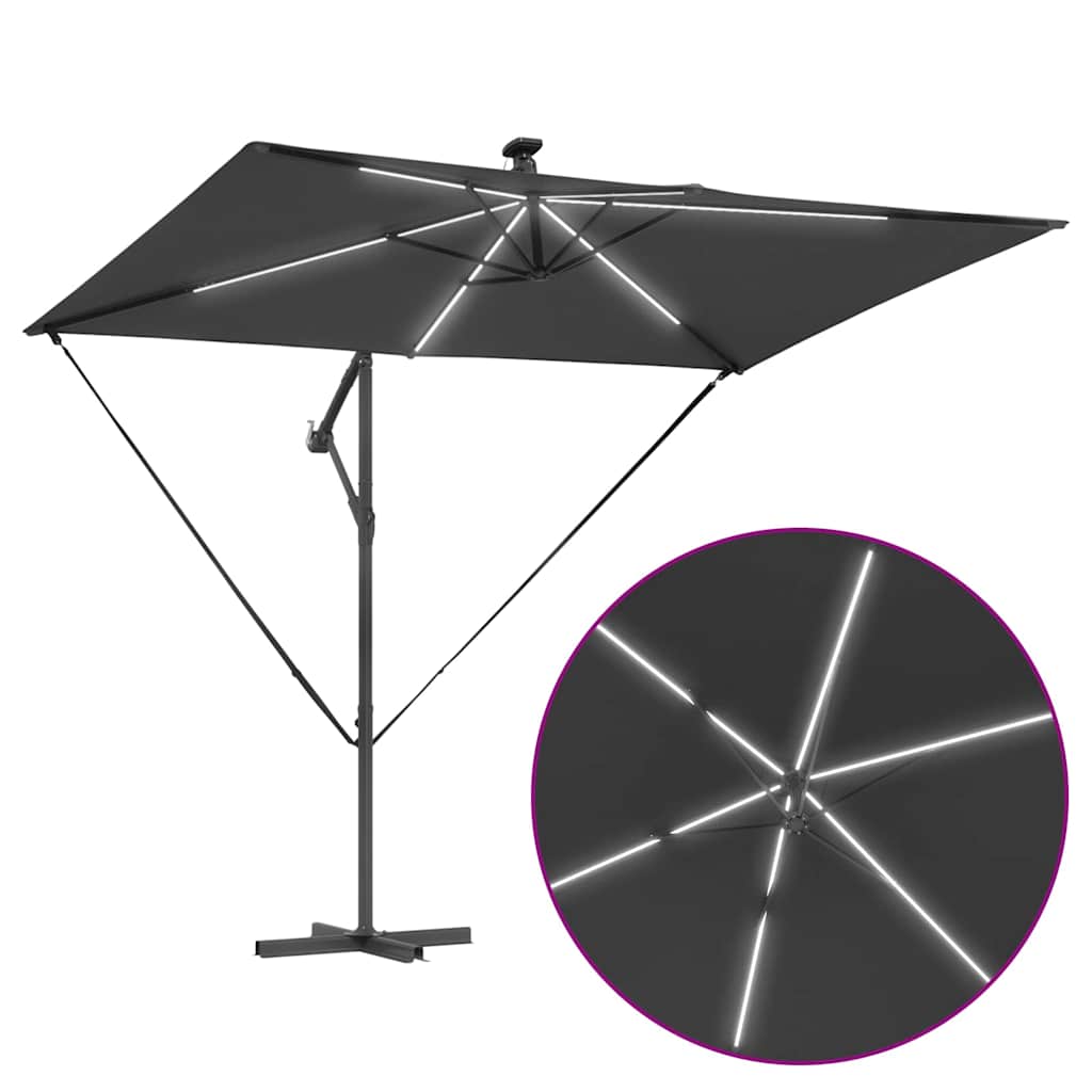 • Mukana tulevat osat: Varjo tulee aurinkokäyttöisten LED-valojen kanssa, jotka luovat kauniin valaistuksen illaksi ilman lisävirtaa. Kätevä käsikahva helpottaa avaamista ja sulkemista, ja kaltevuusominaisuus mahdollistaa varjon helpon säädön.