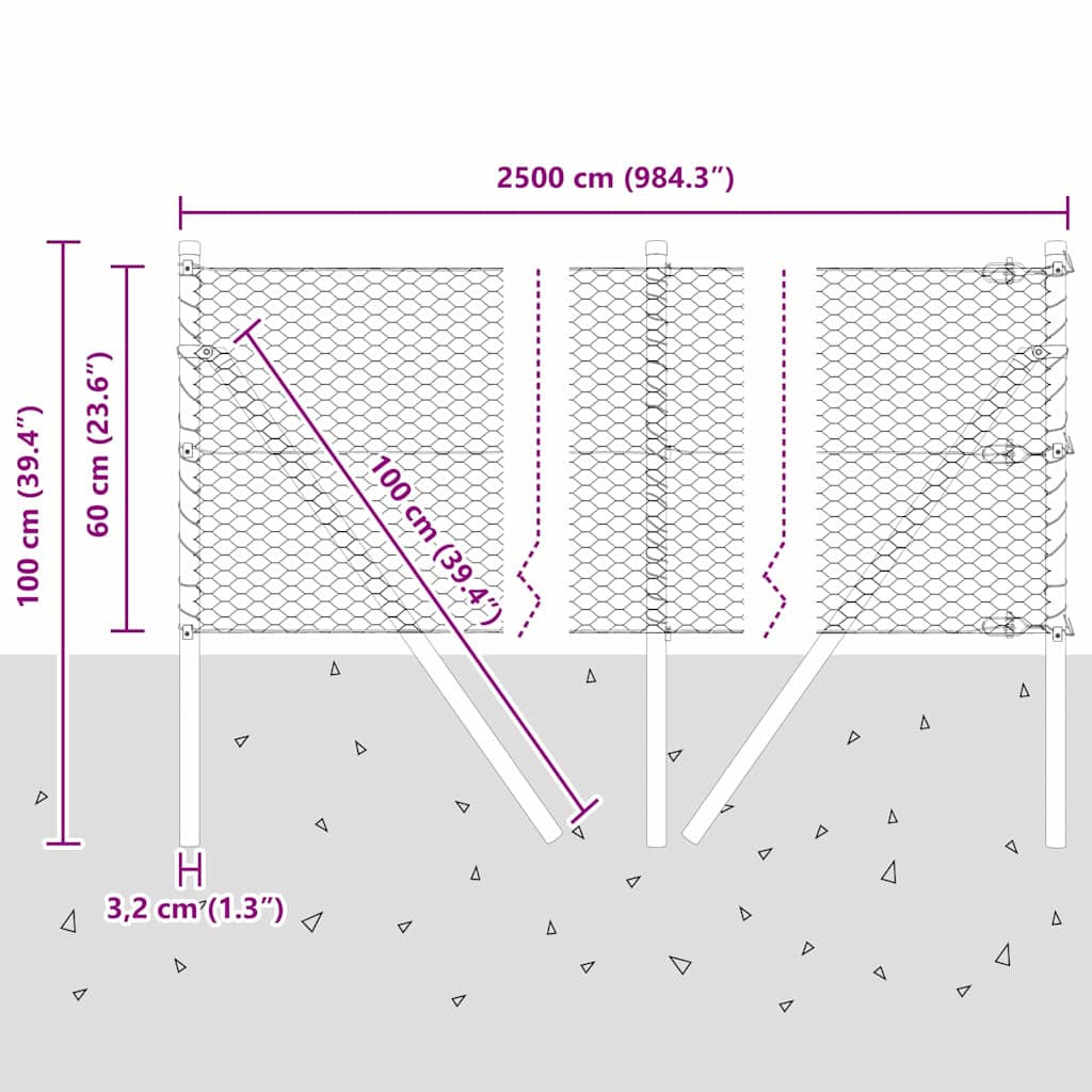 Kuusikulmainen Aita 0.6×25 m Galvanoitu Teräs, Aitatukia 13 kpl Ø32 mm 100 cm Galvanoitu Teräs