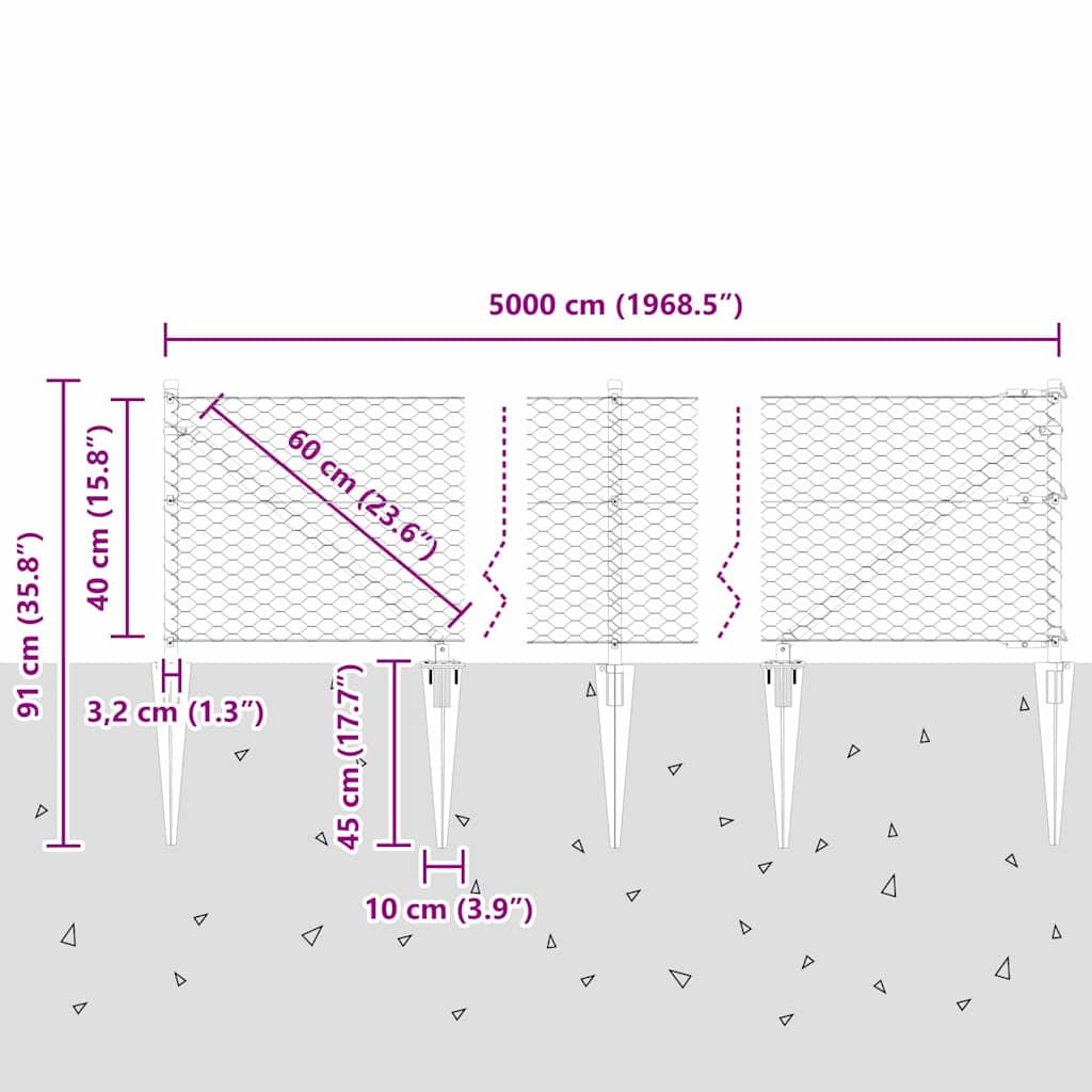 Kuusikulmainen aita Harmaa 0.4×50 m Teräs, Aitaruuvit 13 kpl Ø32 mm 60 cm Galvanoitu teräs