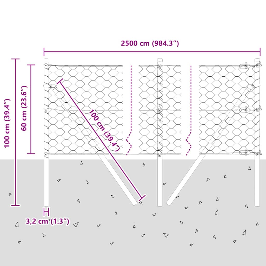 Kuusikulmainen Aita Harmaa 0.6×25 m Teräs, Aitatolpat 13 kpl Harmaa Ø32 mm 100 cm Galvanoitu Teräs