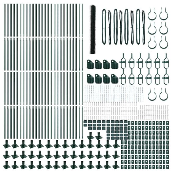 • Kattava Paketti: Mukana kaikki oleelliset osat, kuten aitapostit, raiteet, kiinnitysklipsit ja vihreä verkko, mikä helpottaa asennusta.