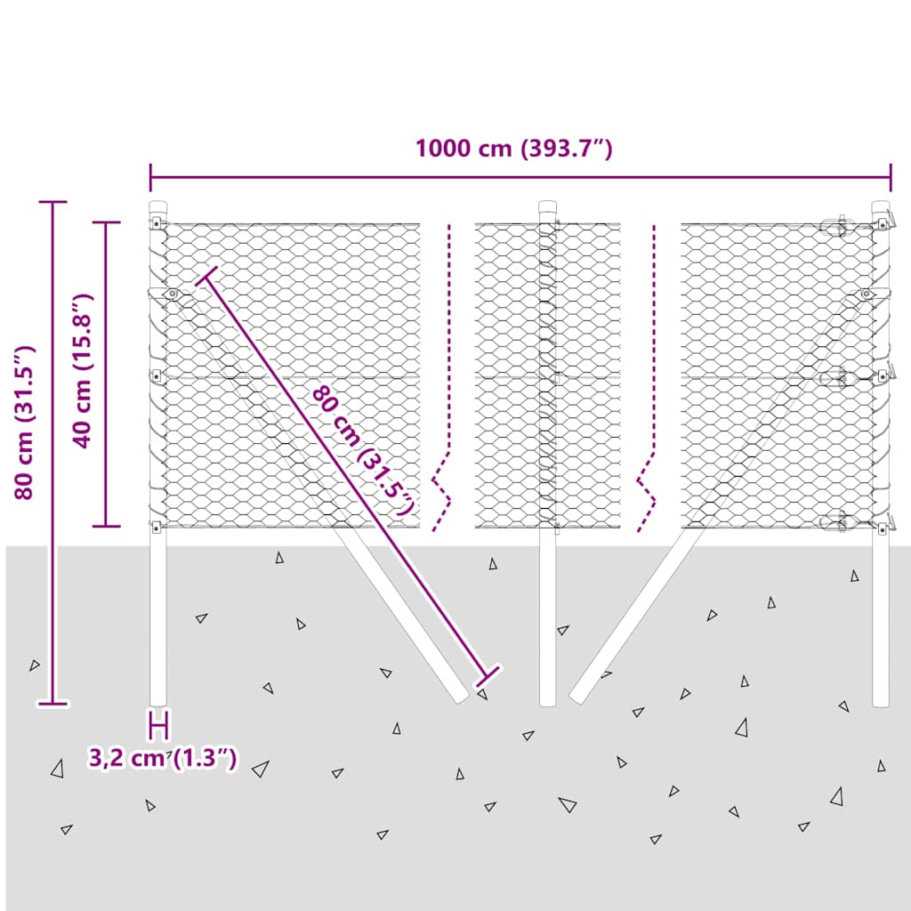 Kuusiomuotoiltu aita 0.4×10 m Galvanoitu teräs, Aita-pylväät 7 kpl Ø32 mm 80 cm Galvanoitu teräs