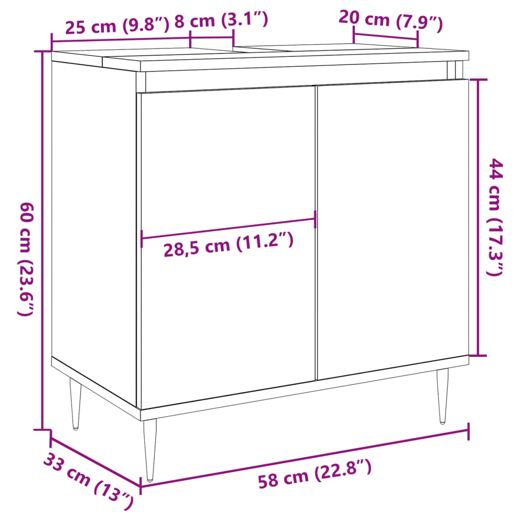 • Reilusti säilytystilaa: Kylpyhuoneen kalusteessa on yksi suuri lokero kahden oven takana. Se tarjoaa useita säilytysvaihtoehtoja tavaroiden säilyttämiseen kylpyhuoneessa.