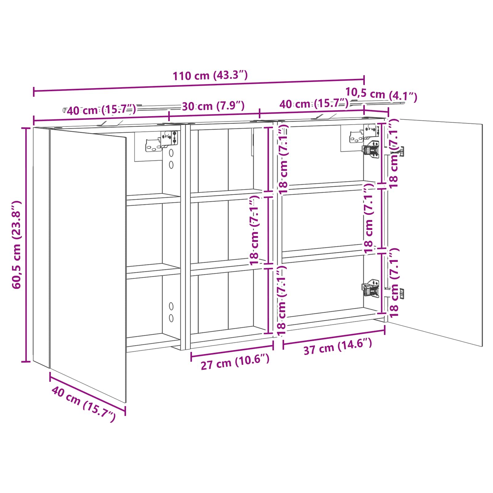 • 2 x Kylpyhuoneen peilikaappi: 40 x 10,5 x 60,5 cm (P x L x K)
