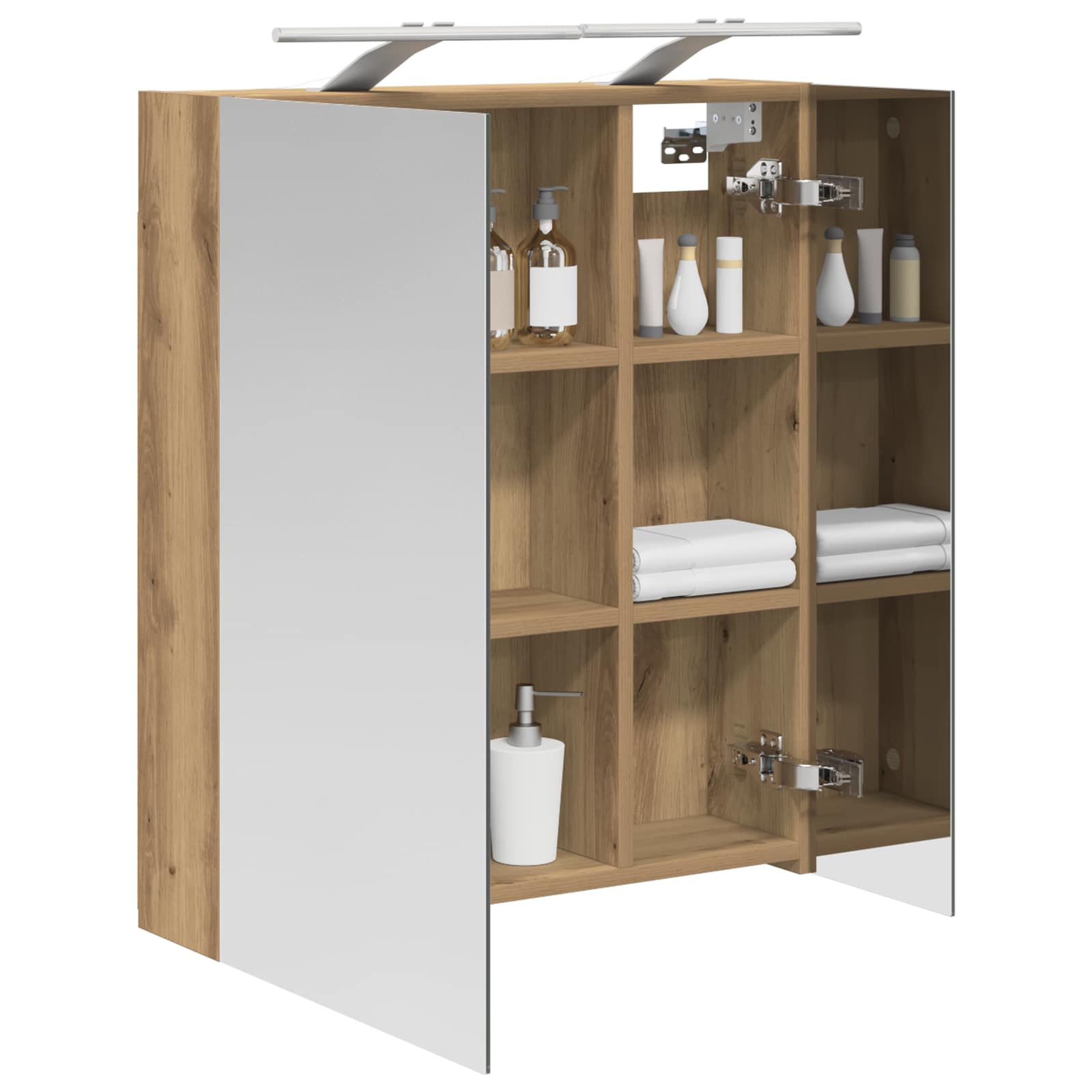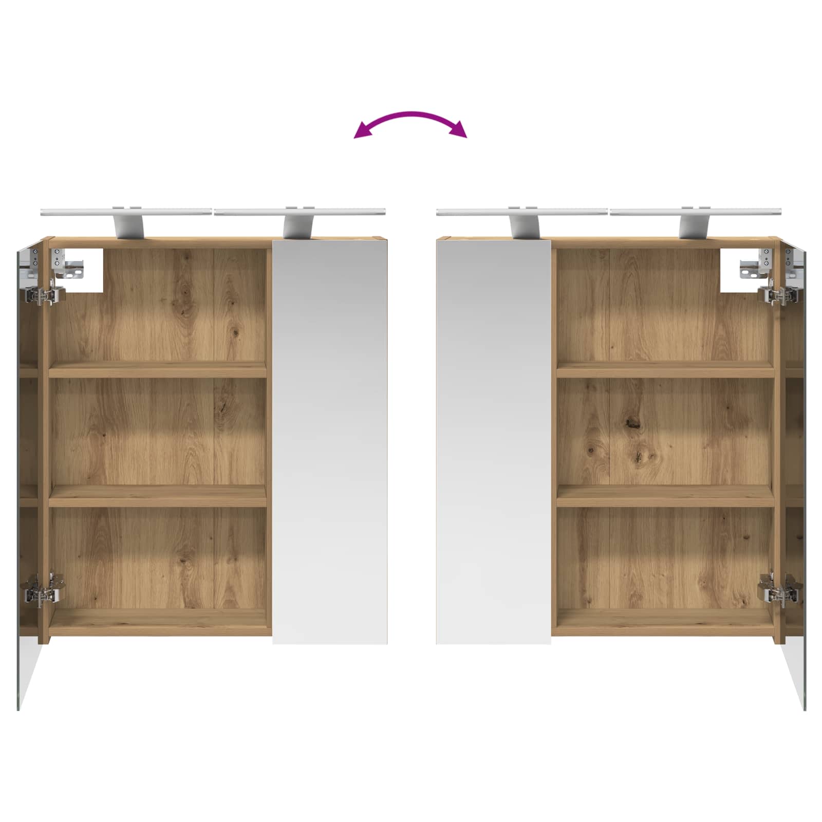 Tämä moderni kylpyhuoneen peilikaappi yhdistää tyylin ja käytännön, joten se on loistava lisä mihin tahansa kylpyhuoneeseen. Suorakaiteen muotoinen runko tuo minimalistista ilmettä, joka sopii nykyaikaisiin sisustusratkaisuihin. Se toimii sekä säilytyspaikkana että esteettisenä elementtinä, yhdistäen kaksisuuntaisen peilin ja levyhyllyt, jotta kylpyhuone pysyy siistinä ja arki sujuu paremmin.