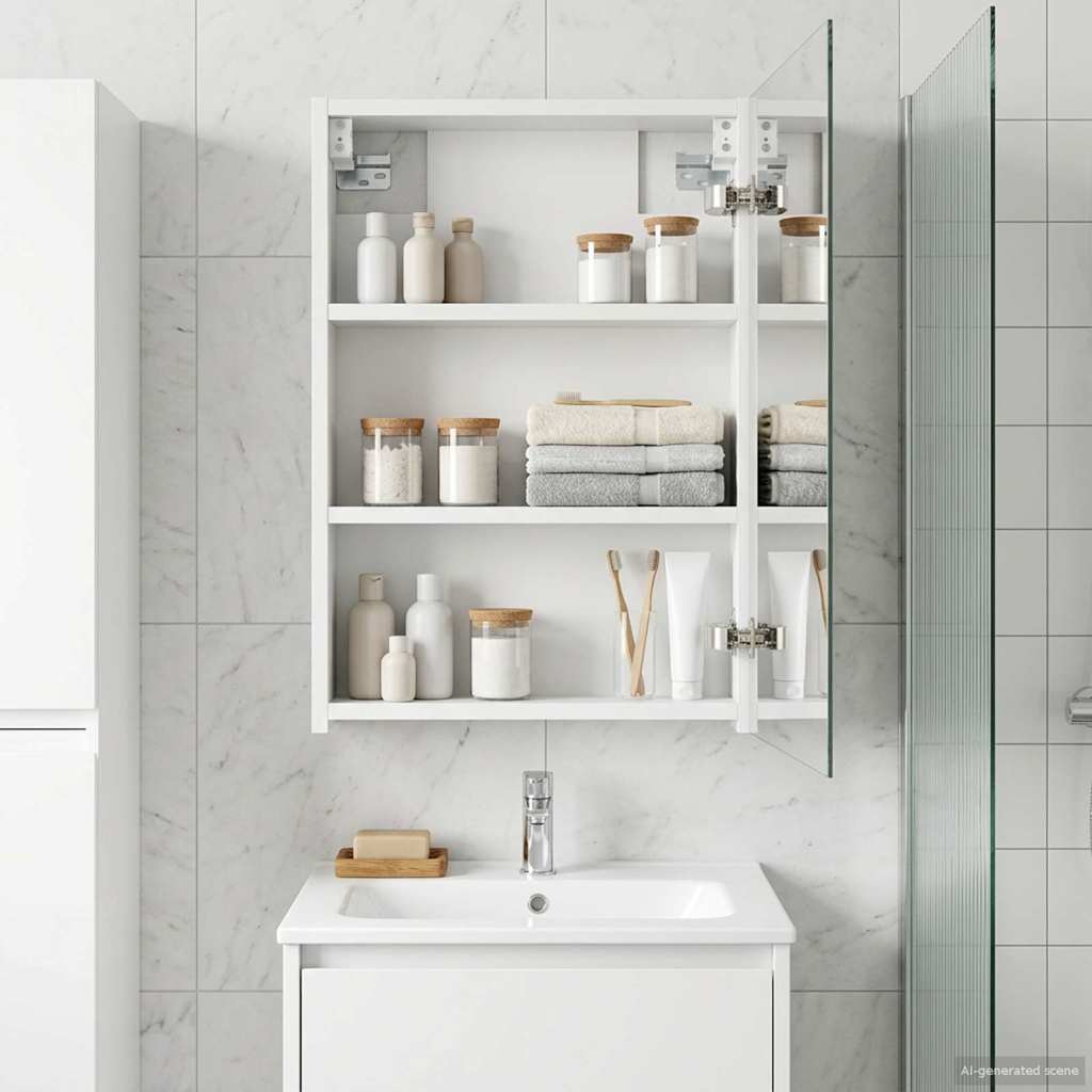 • Seinälle Asennettava Muotoilu: Seinälle asennettuna kaappi säästää lattiatilaa, tehden siitä loistavan valinnan kaikenkokoisiin kylpyhuoneisiin. Liittää tilan tehokkuuden ja siistin ilmeen.