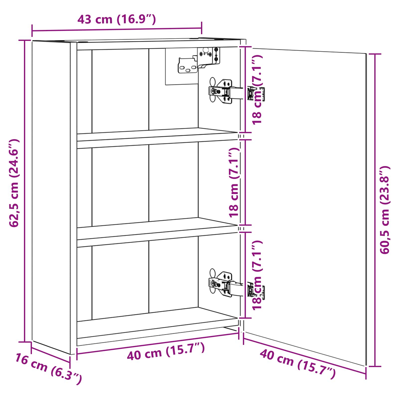 • Yleiset mitat: 43 x 16 x 62,5 cm (P x L x K)