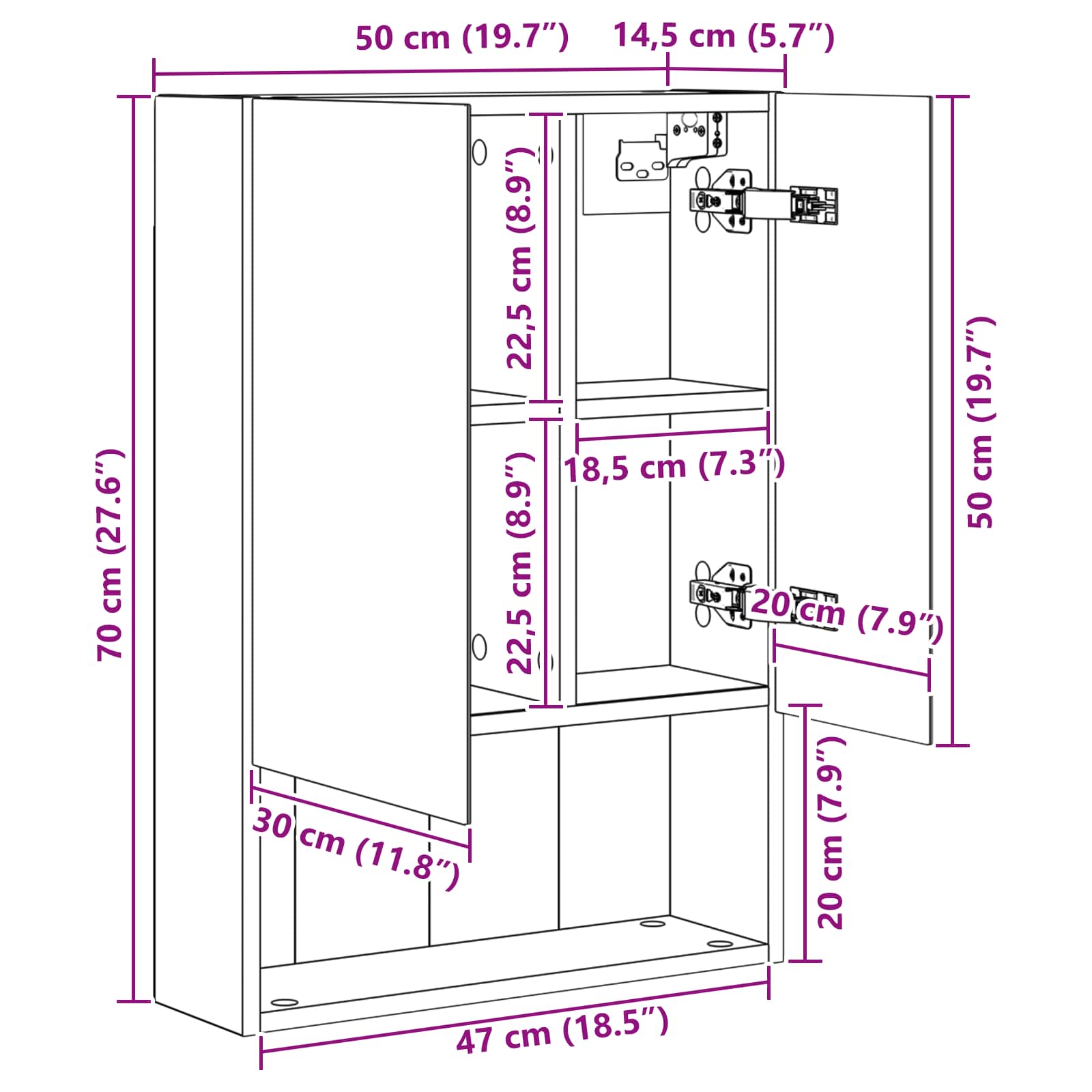 • Yleiset mitat: 50 x 14,5 x 70 cm (P x L x K)