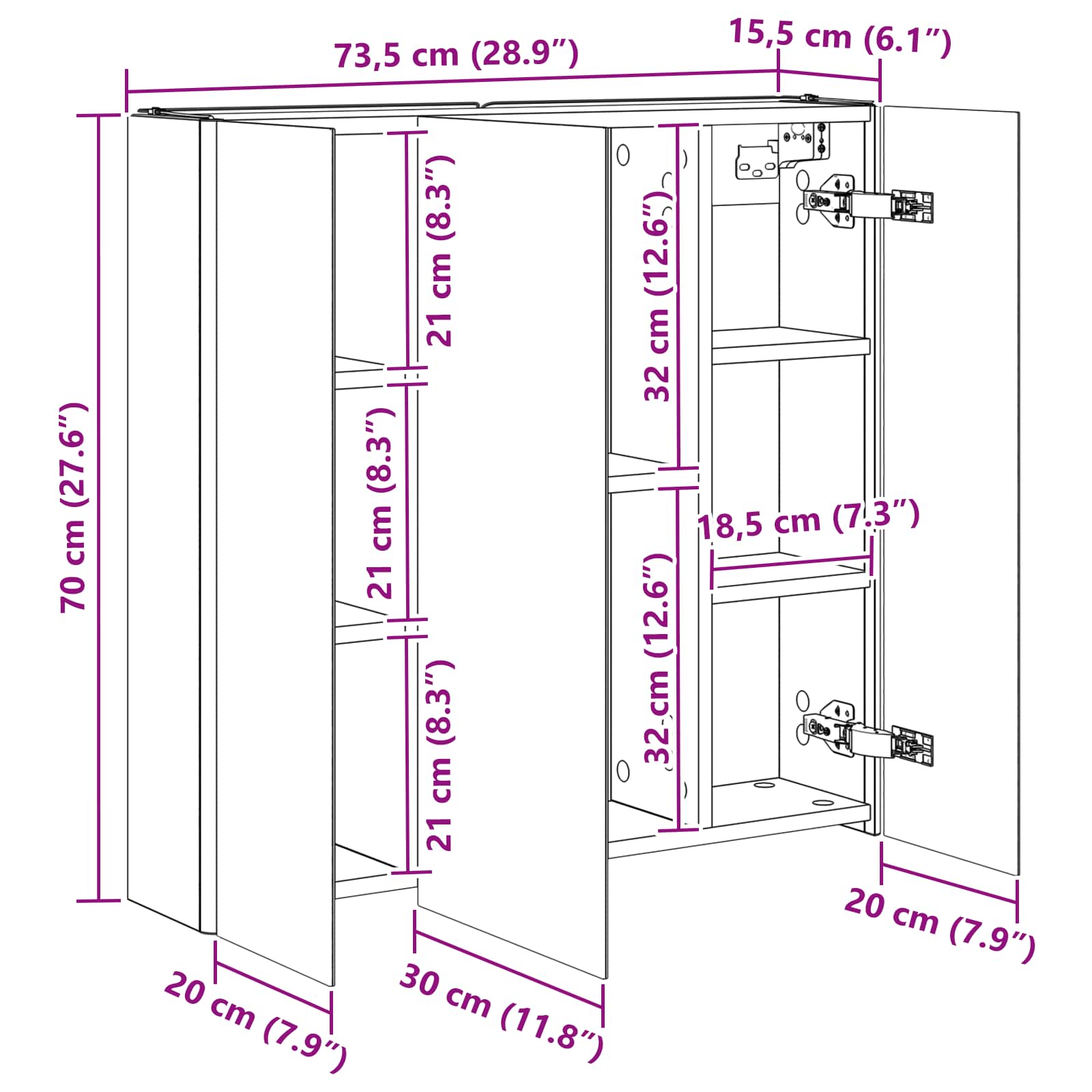 • Yleiset mitat: 73,5 x 15,5 x 70 cm (P x L x K)