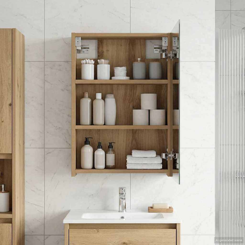 • Tekninen Puurakenne: Kaappi on valmistettu kestävästä teknisestä puusta, joka varmistaa pitkän käyttöiän ja hienon ilmeen, mikä parantaa kylpyhuoneen sisustusta.
